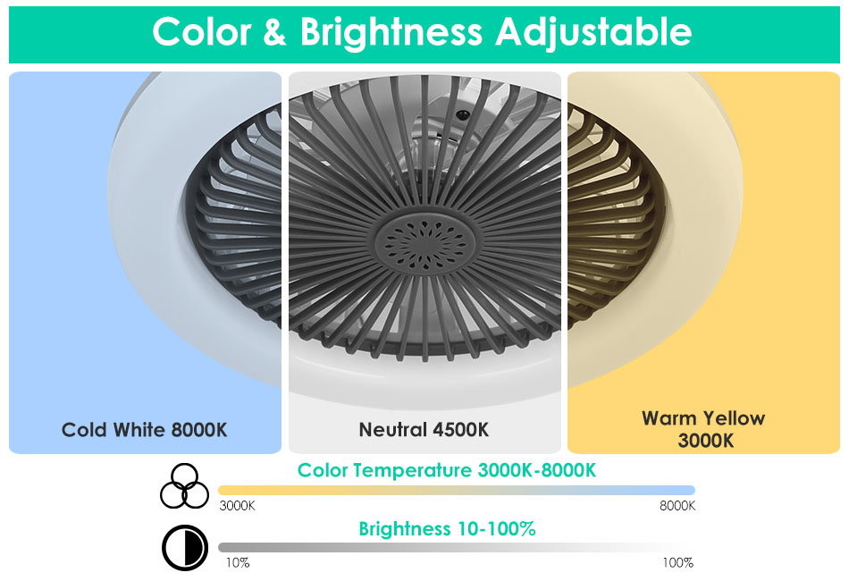 - Adjustable Light Color & Brightness:This ceiling fan with light has 3 preset color temperatures including 8000K cool white,4500K nature white and 3000K warm white,give you bright,soft and flicker-free lighting. Considered people who are sensitive to the light color and temperature,10-100% dimmable adjustable brightness and color can be flexibly adjusted to your preferred illumination.