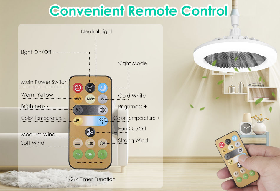 - Remote Control Fan:You can adjust the light color,brightness,fan speed,fan mode and timer through the handheld remote control. Powered by the E2 socket,this fanlight head can horizontally tilt down about 135° to reach wider angle area.