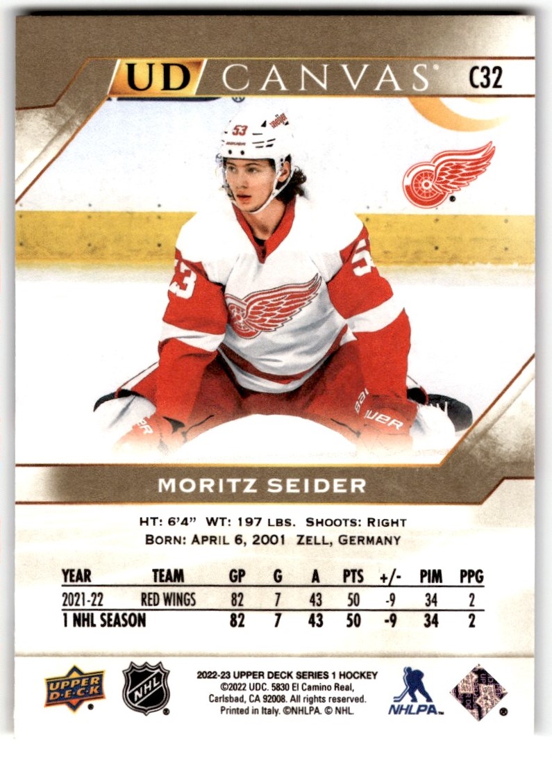 | Description: | Moritz Seider | | Category: | Hockey | | Year: | 2021 | | Product: | Upper Deck UD Canvas | | Team: | Detroit Red Wings | | Card Number: | C32 | | Dimensions: | 3½" x 2½" | | SKU: | HK EB0038 R01 O (50) |