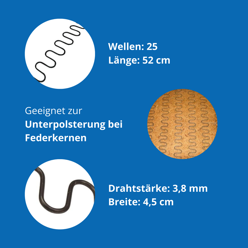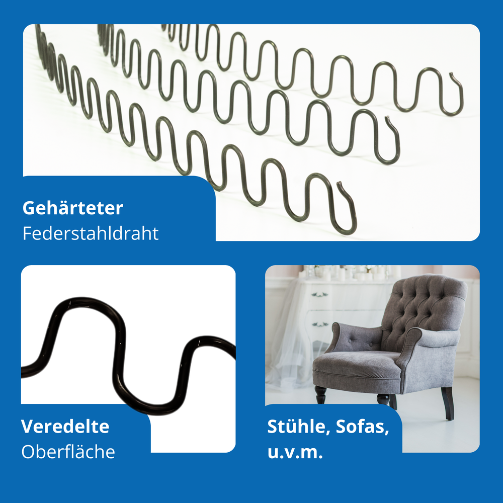 Unsere hochwertigen Nosag Wellenfedern – auch bekannt als Zickzackfedern – sind die perfekte Wahl für alle, die beim Polstern auf Qualität setzen. Erhältlich in den Längen 44 cm, 52 cm und 64 cm, eignen sie sich ideal für den Einsatz in Sofas, Sesseln, Stühlen oder selbstgebauten Sitzmöbeln. Diese Nosag-Wellenfeder besteht aus gehärtetem, oberflächenveredeltem Federstahldraht mit 3,8 mm Stärke und wird als Unterfederung in modernen Polstermöbeln verwendet. Ein regelmäßiger Abstand von ca. 5 cm zwischen den Federn sorgt für optimale Elastizität. Für die Montage empfehlen wir unsere Spannhilfe.