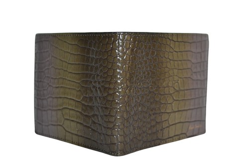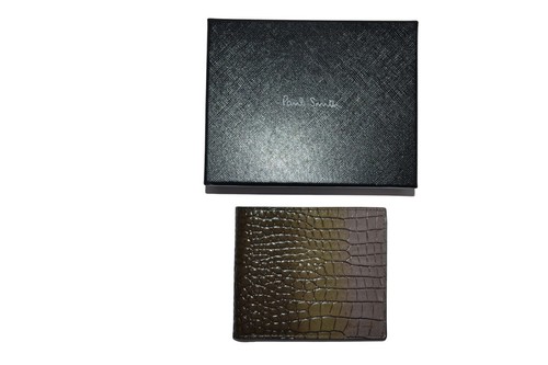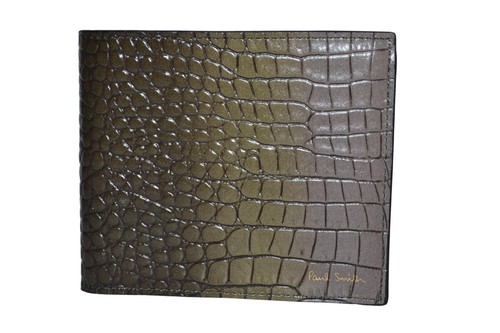 This stunning leather wallet is crafted in Italy from calf / sheep leather, featuring a heavily embossed mock croc relief to the outside with a gradient brown/olive tonal colourway, gold foil embossed Paul Smith signature logo
