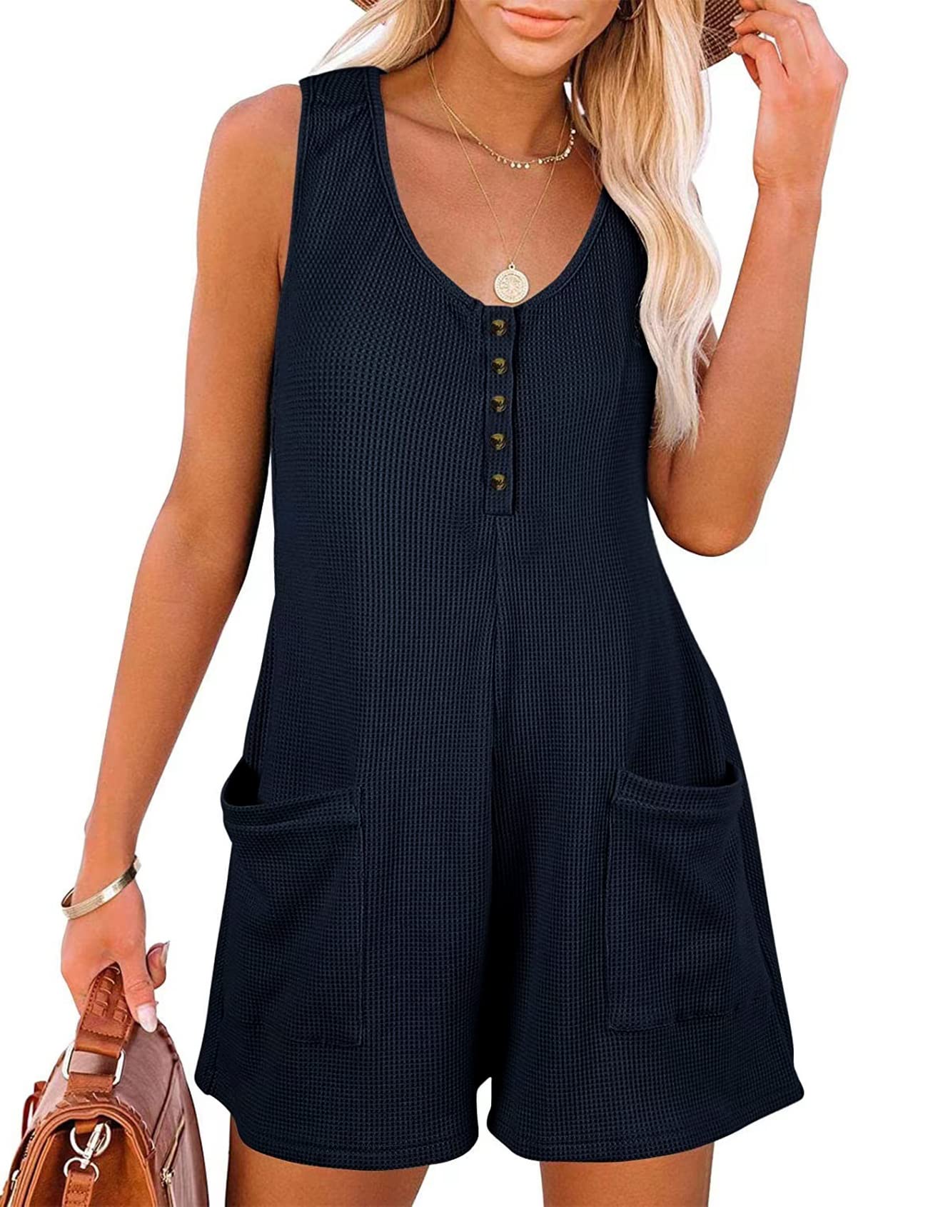Women's Summer V Neck Casual Rompers Sleeveless Button Down Waffle Short Jumpsuits with Pockets(Navy-L)
