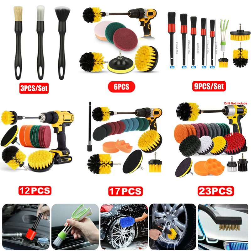 ✅30 Piece Drill Cleaning Attachment Set, Includes: 3 shape of Medium drill power scrubber brushes, 9 Piece different stiffnesses Scouring pads, 2 Piece scrub sponge, 1 Piece 4 inch backer with screw, 1 Conical sponge, 1 Extension rod, 5 different size detailing brush, 3 pcs wire brush and 2pcs foam cleaning pads, 1 pcs automotive air conditioner,1 pcs cleaner glove,1pcs towel.