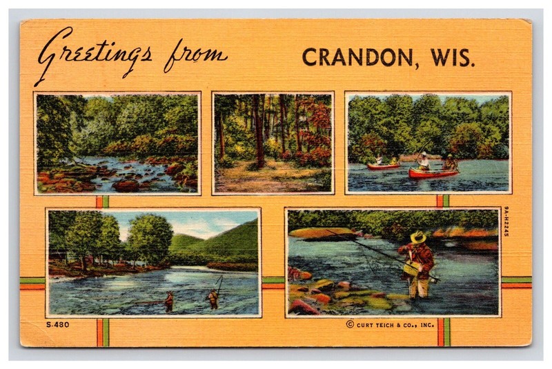 You are looking at a: WI Outdoors, Fishing, Greetings From Crandon, Wisconsin postcard that is unposted. The postcard is in great shape.