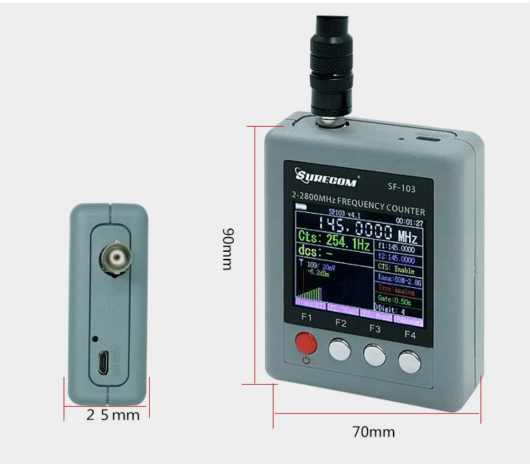 SURECOM SF-103 hand held frequency counter is a more practical counter, even advanced functions such as field strength measurement are included. A compact, truly pocket-sized test tool designed for ease of use and reliable performance. Supplied complete with internal lithium-ion battery, AC wall charger and antenna.