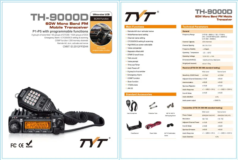TYT Mobile Car Radio TH-9000D Walkie Talkie Ham Radio VHF136-174MHz or UHF400-490MHz Walkie Talkie 60W/45W Functions: Frequency Range: VHF:136-174MHz 245-245.9875MHz (220-260MHz); UHF: 400-480MHz. (These Frequency Range can be selectable to use.) 1.Output Power: VHF: 10W/25W/60W UHF: 45W/25W/10W 2. 8 Group's of Scrambler 3.1750Hz Tone CTCSS/DCS setting & scanning 4. 0-9 SQL grade setting 5. Frequency/Channel scanning 6. High/Mid/Low power selectable 7.Voice commander 8. Repeater offset shift 9.Keypad lock function 10.Contact book 11.Battery voltage display 12. DTMF/2 tone/5 tone 13. Remote kill/ stun/ activate/ revive 14. Emergency alarm 15.Wide/Narrow band setting 16.Channel name editing 17.Reverse frequency 18.VFO step setting:5/6.25/10/12.5/20/25/50kHz Specification: General: Frequenvy Range: 136-174/245-246/400-490MHz Channel Capacity: 200 Channel Spacing: 5/6.25/8.33/10/12.5/15/20/25/30/50KHz Freruency Stability: 2.5ppm Operating Temperature: -20℃ ~ + 60℃ Operating Voltage: 13.8V DC ± 15% Dimension(HxWxD): 145mm x190mm x47mm Weight(with bracket): 1200g