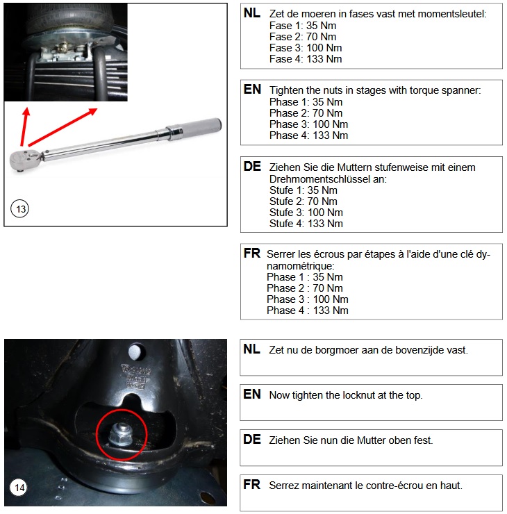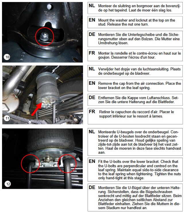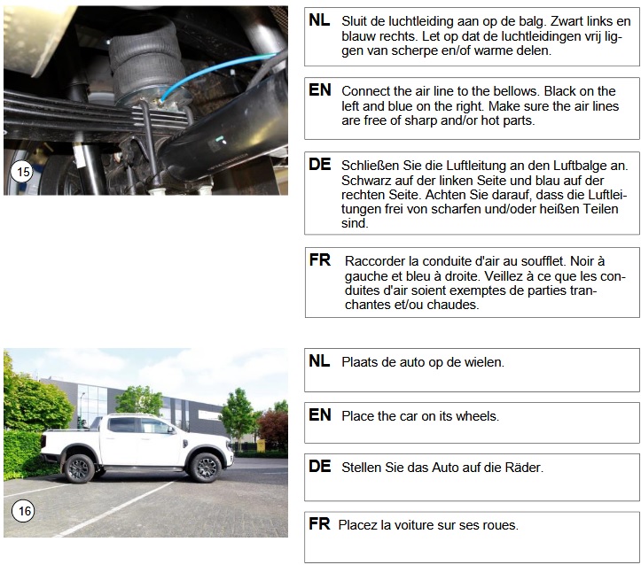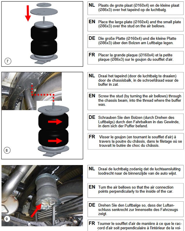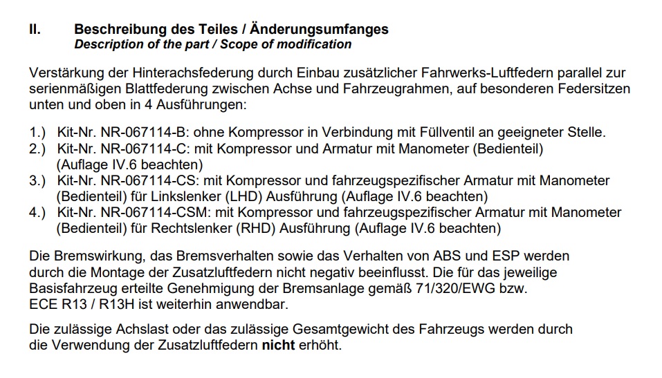 Besteht aus zusätzlichem Montagematerial (Luftschlauch, T-Stücke, etc.), 45l Kompressor inklusive Halterung im Motorraum und einem fahrzeugpezifischen Doppelfahrerhausbedienteil, womit sich die Luftfedern bequem vom Fahrerhaus bedienen lassen. Beide Bälge können unabhängig von einander bis zum maximalen Druck befüllt und bis zum Minimumdruck auch wieder entleert werden. Dies hat den Vorteil, dass verschieden Beladungen ausgeglichen werden können und dass das Fahrzeug bei Kurvenfahrten immer stabil bleibt.