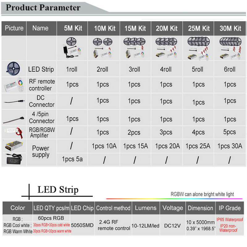 5050 RGB LED Strip Waterproof 5M 10M 15M 20M 25M 30M DC 12V RGBW RGBW LED Light Strip 60led/m add Power and 2.4G RF Controller Specifications: 1.Chip Model: SMD 5050 2.Emit Color: RGB / RGBW / RGBWW 3.Protection Rate :IP20 Not Waterproof / IP65 Waterproof 4.Working Voltage: 12V DC 5.LED Quantity: 60leds / m, 5meter / roll 6.View angle: 120 ° ~ 140 ° 7.Working Temperature: -20 ° to 50 °. 8. Power Adapter : 5A / 10A / 15A / 20A /25A /30A 9.Remote : 2.4G RF Touch Controller ( For RGB / For RGBW RGBWW ) Application: