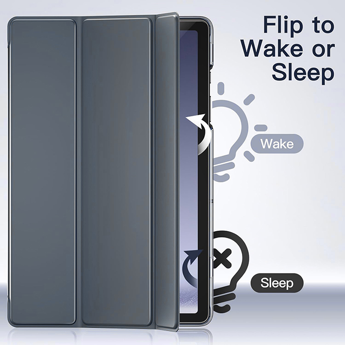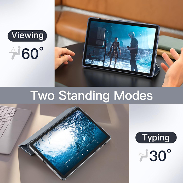 - [Tri-Fold Ständer Cover] Die vordere Abdeckung kann zu einem Ständer gefaltet werden, um Ihr Tablet in zwei verschiedenen Positionen zum Betrachten und Tippen zu unterstützen.