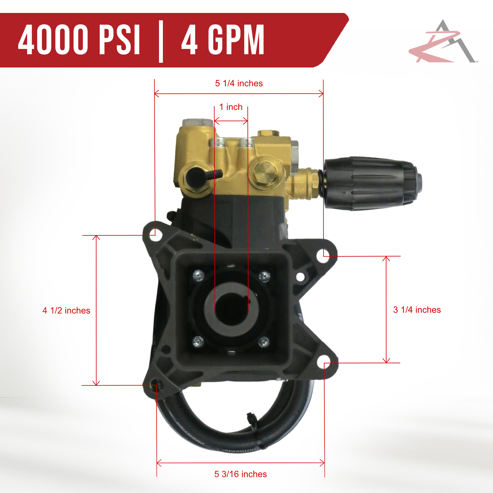 • Specs - Maximum Pressure: 4000 PSI. Maximum Flow: 4 GPM. Maximum Pump Speed: 3400 RPM. Shaft Size: 1". Maximum Fluid Temperature: 140° F. Inlet Type: Standard Garden Hose. Outlet Type: 3/8" Female. Oil Capacity: 13.35oz. Refer to images 2 and 3 for more information