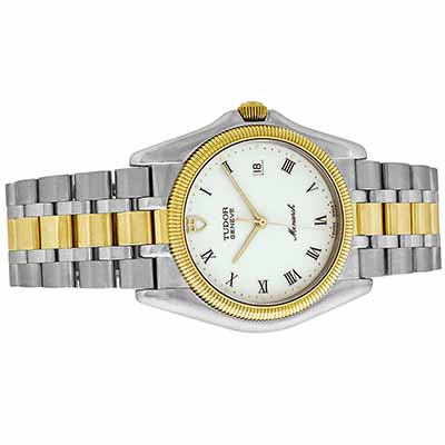Palisade Jewelers is proud to offer this men's authentic TUDOR watch. This Monarch model is finely crafted from two-tone stainless steel. This watch features a white Roman numeral dial with a date window at three o'clock and a Tudor logo at twelve o'clock. This watch is highlighted by a yellow gold fluted bezel and a signed Tudor crown. This Tudor features a two-tone stainless steel Jubilee bracelet with signed deployment buckle.