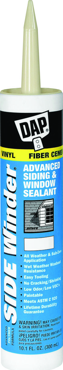 DAP Side Winder Advanced polymer formula siding and window sealant delivers excellent performance on vinyl, fiber cement, aluminum, wood siding and windows. It forms a flexible, watertight and weatherproof seal that withstands up to +/-25% total joint movement. It offers wet weather and low temperature application. It is paintable and has virtually no VOC's (less than 1%).