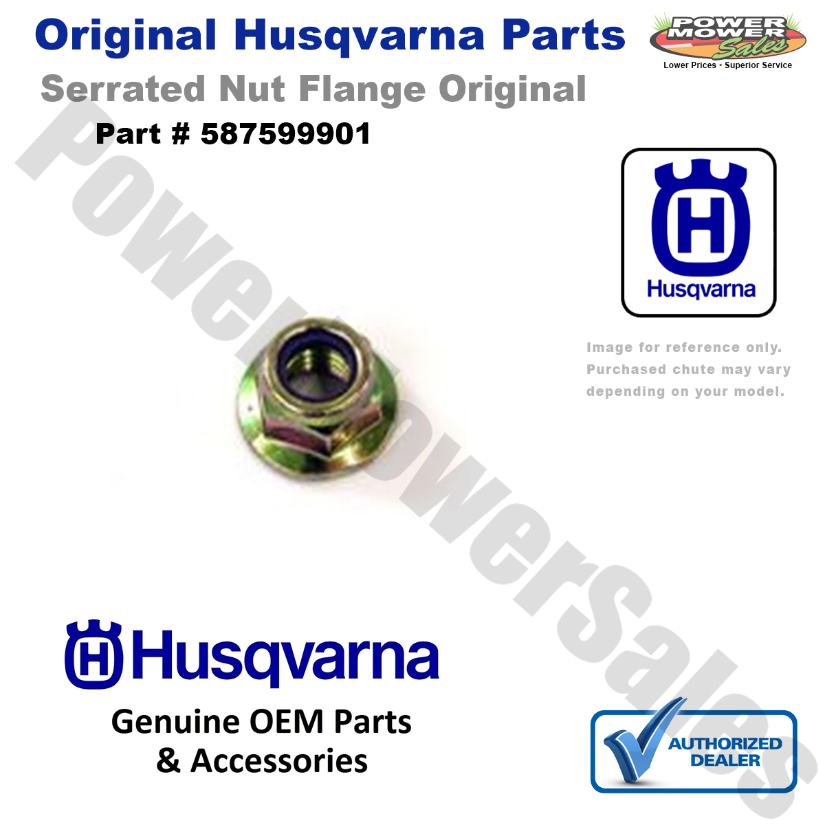 HUSQVARNA part 587599901 - NUT.FLANGE.SERRAT.3125-18.5625 is an original part from Husqvarna Group. This product belongs to Spares for US made lawnmovers category. Husqvarna Group is a global leading producer of outdoor power products.