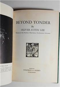 BEYOND YONDER BY OLIVER JUSTIN LEE AND PUBLISHED BY CHAPMAN AND GRIMES IN 1939 FIRST EDITION IN DUST JACKET WITH ORIGINAL PRICE OF $2.50 UNCLIPPED. AUTHOR WITH A PHD WAS THE DIRECTOR OF THE DEARBORN OBSERVATORY NORTHWESTERN UNIVERSITY. BOOK IS IN VERY GOOD CONDITION WITH SHELF WEAR, NO WRITING INSIDE. DUST JACKET IS IN GOOD CONDITION WITH SMALL TEARS/CHIPS OFF SPINE AND FOLD ENDS.SMALL DISCOLORATION LOWER INSIDE SPINE, EDGE AND SPINE WEAR. POSTAGE $7.00 IN THE UNITED STATES AND BY ARRANGEMENT OVERSEAS. I COMBINE ORDERS TO SAVE ON POSTAGE.