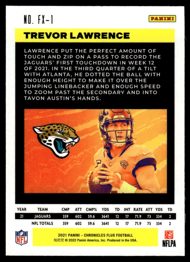 | Description: | Trevor Lawrence | | Category: | Football | | Year: | 2021 | | Product: | Panini Chronicles Flux Rookies | | Set: | NFL Card | | Team: | Jacksonville Jaguars | | Card Number: | FX-1 | | Rookie: | Yes | | Dimensions: | 3½" x 2½" | | SKU: | FT a0052 R01 P (7) |