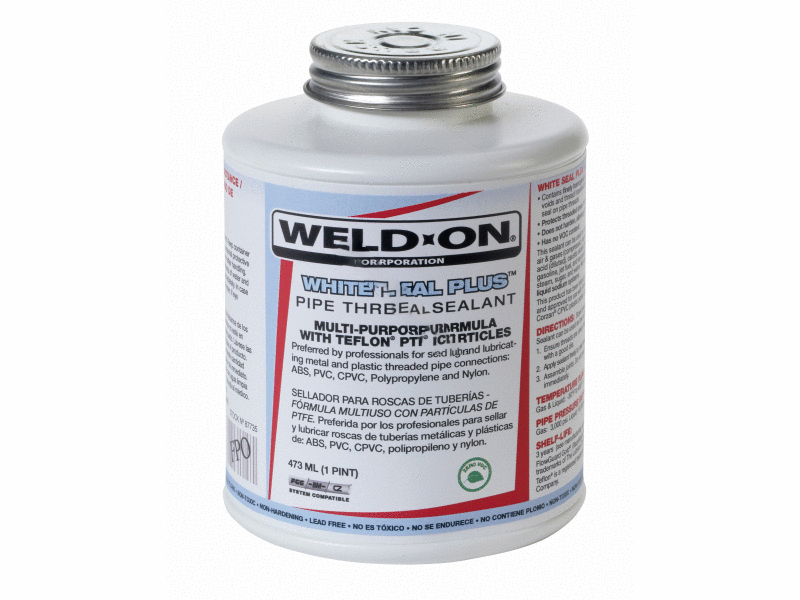 Featuring a non-setting formula that allows for easy and damage-free disassembly of pipe joints, Weld-On 87730 White Seal Plus Multipurpose Pipe Thread Sealant with PTFE .5 pt helps protect threaded areas from rust and corrosion while ensuring a leak-proof seal. This pipe sealant features finely homogenized Teflon PTFE particles that fill thread cracks and imperfections, making it a preferred choice of professionals for sealing metal and plastic threaded pipe connections. The sealant creates a pressure-tight joint that can withstand the demands of various piping systems--including those carrying air and gases, corrosives, freons, fuels, oils, petroleum, propane, solvents, steam, sugar, or water. Formulated for versatility, this pipe thread sealant works with all metal and plastic pipes, including PVC, CPVC, ABS, polypropylene, and nylon. It has been tested and is monitored on an ongoing basis to assure its chemical compatibility with FlowGuard Gold, BlazeMaster, and Corzan pipes and fittings. And thanks to its zero-VOC content, it helps promote a better working environment for pipe repairers. This pipe thread sealant is not recommended for oxygen, fluorine, or liquid sodium systems.