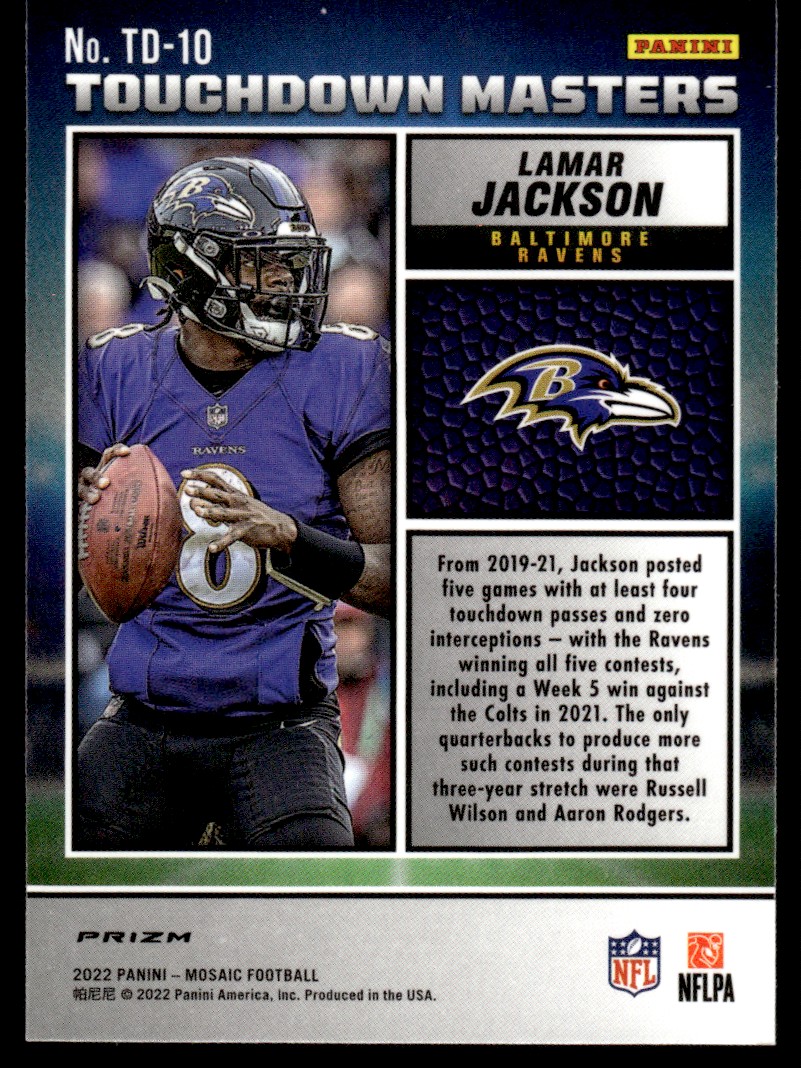 | Lamar Jackson Prizm 2022 Panini Mosaic Touchdown Masters #TD-10 NFL Card |