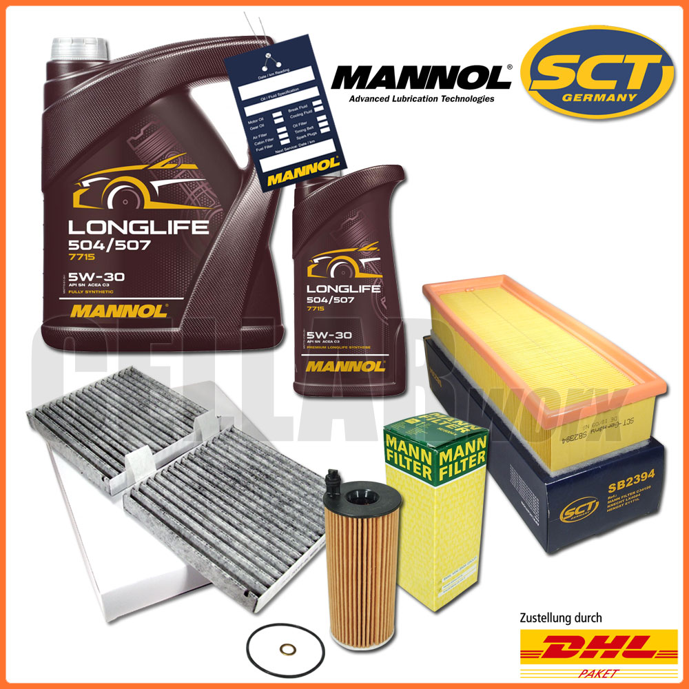 Inspektionskit passend für BMW X3 X4 F25 F26 sDrive18d 150 PS, xDrive20d 163 PS und 190 PS, Lieferumfang: Innenraumfilter mit Aktivkohle (Markenfilter) Motor-Luftfilter (SCT-Germany) Ölfilter mit Dichtung und Kupferring (MANN) Ölwechselanhänger 6 Liter MANNOL 7715 Longlife 504/507 API SN Entspricht folgenden Freigaben / Spezifikationen / Produkten: SAE 5W-30 API SN ACEA C3 MB 229.51 VOLKSWAGEN 504.00 VOLKSWAGEN 507.00 VOLKSWAGEN TL 52 195 BMW Longlife-04 PORSCHE C30 Universelles