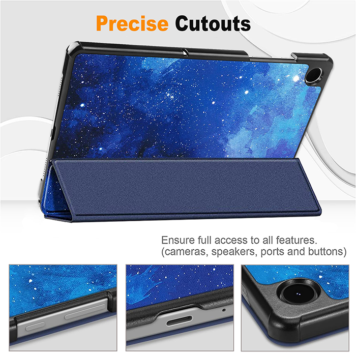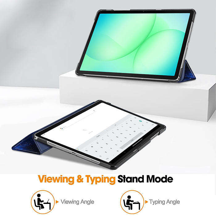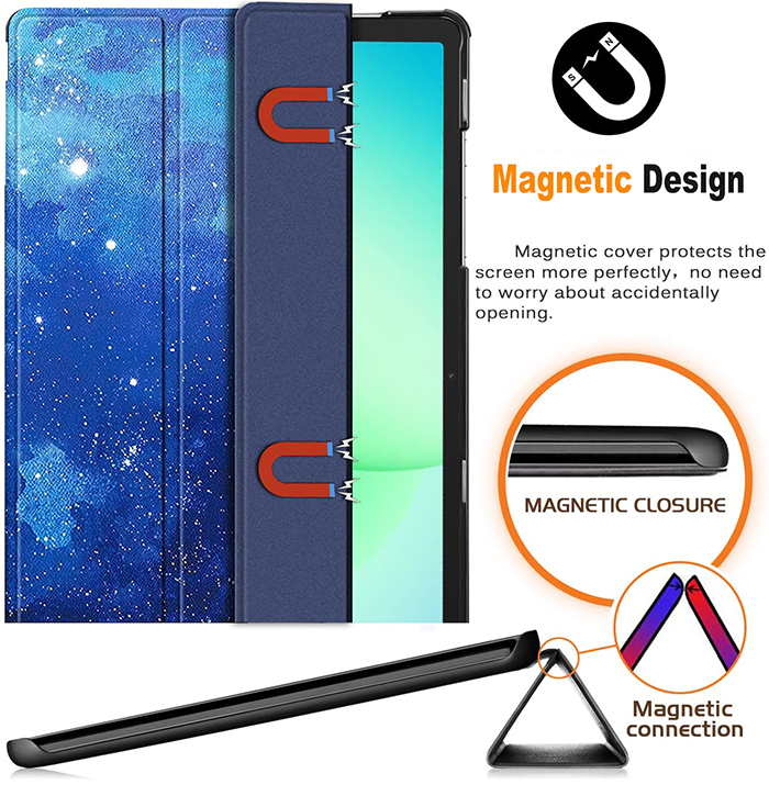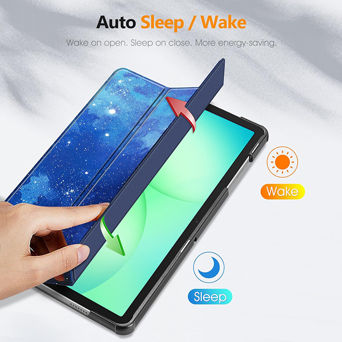 • Auto Schlaf / Wach Funktion - Durch die eingebauten magnetischen Streifen wird beim Öffnen/Schließen der Hülle der Ruhezustand automatisch aktiviert/deaktiviert, um Strom zu sparen.Notiz: Es gibt keine schlaf/aufwach Funktion von Samsung Galaxy Tab A9 8.7 / Tab A11 8.7