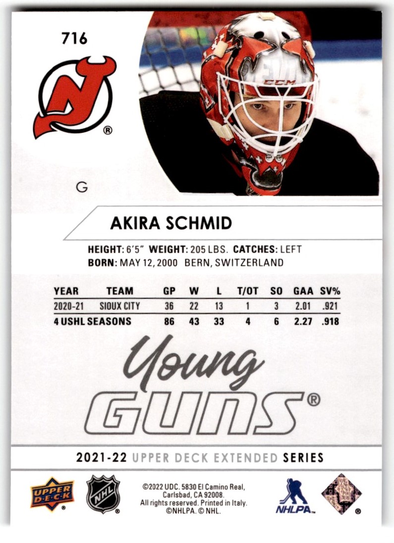 | 2021-22 Upper Deck Young Guns Akira Schmid Rookie #716 New Jersey Devils |