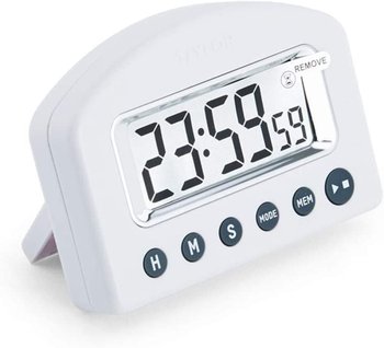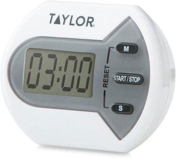 Great for the kitchen, workout room, or home shop, this small digital clock/timer is useful in counting down cooking time, timing circuit training exercises, or tracking paint or wood glue drying time. No bigger than the palm of a hand, the timer is magnetized to stick to a refrigerator or stovetop or, alternatively, hangs via a clip or mounts onto a table with its wire stand. The large 0.7-inch LCD screen is easy to read and displays the current time in hours and minutes. When set for timing, the instrument displays in minutes and seconds and times up to 99 minutes and 59 seconds, which is ideal for monitoring cook times on dishes that require slow cooking, such as braised meats. The timer counts either up or down and emits a beeping noise when time has elapsed, which is easily turned off by pressing the Start/Stop button. The timer runs on a single AAA battery (included), and Taylor ensures complete accuracy in its readings through a one-year limited warranty. --Cristina Vaamonde