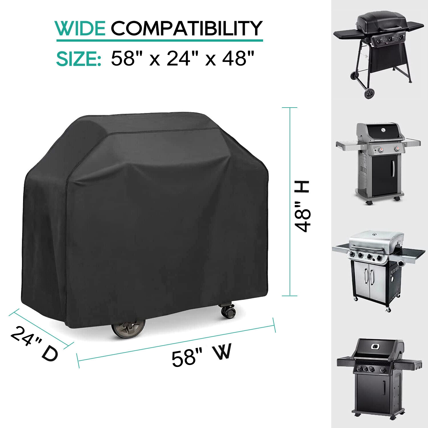 BBQ grill cover measures 58"L x 24"W x 46"H. It fits the most popular models of the grill, such as Weber Spirit gas grill models E-310, E-320, SP-310, SP-320; Weber Genesis II 3-BURNER, 300 SERIES GRILLS, II LX 300 SERIES GAS GRILLS, SILVER B MODELS; 3-BURNER GRILLS, etc.