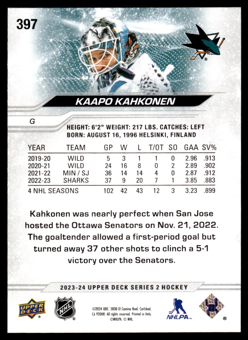 | Kaapo Kahkonen 2023-24 Upper Deck #397 NHL Hockey Card Series 2 San Jose Sharks |