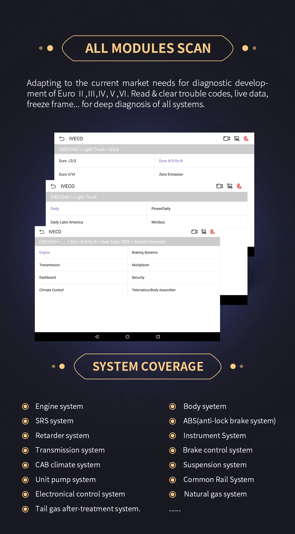 Adapting to the current market needs for diagnostic development of Euro II, III, IV, V, VI. Read & clear trouble codes, live data, freeze frame... for deep diagnostic of all systems.