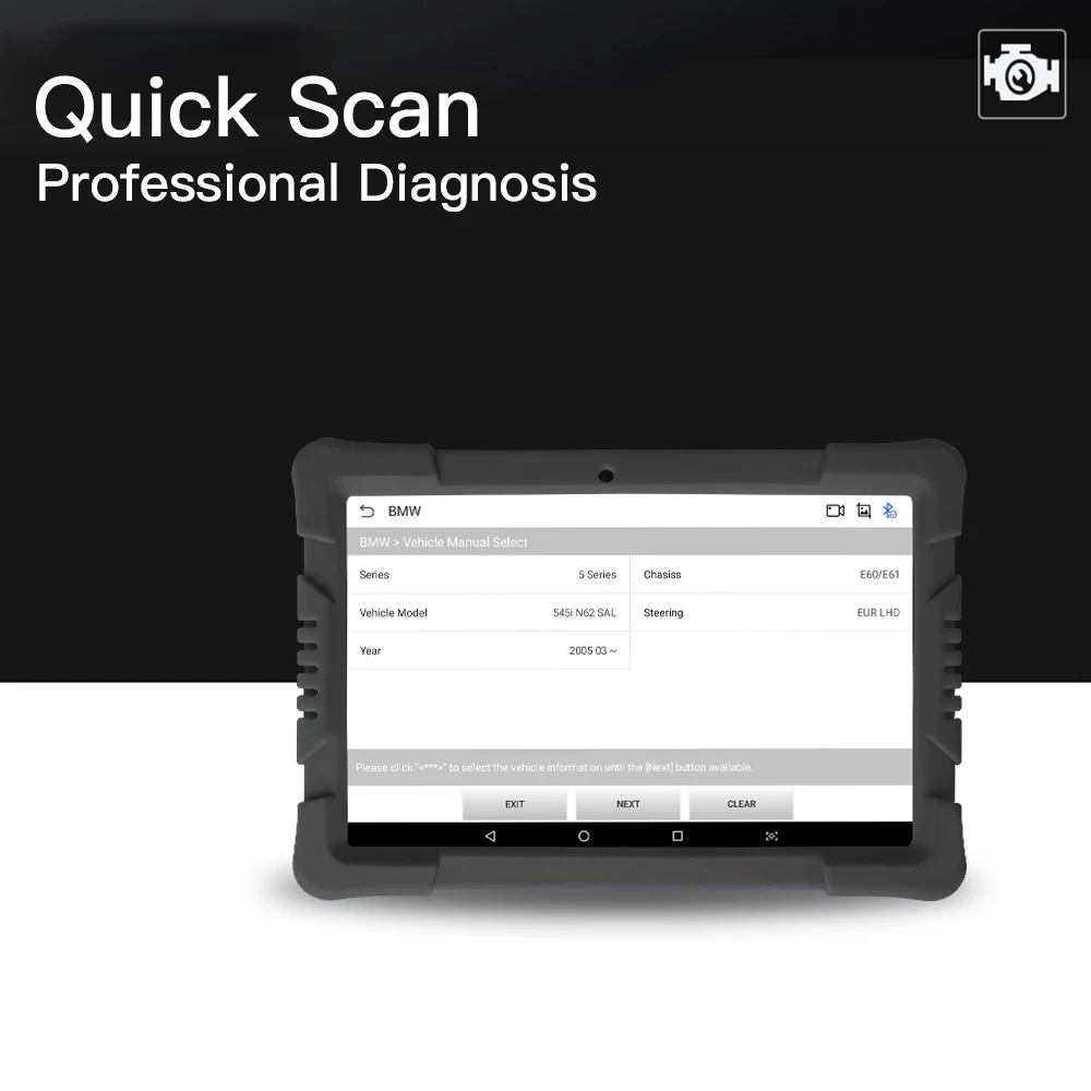 Perform a full system quick scan of passenger cars + trucks, and perform in-depth diagnosis of all electronic systems, including detailed reports, read/clear codes, real-time data, start-up tests, etc.