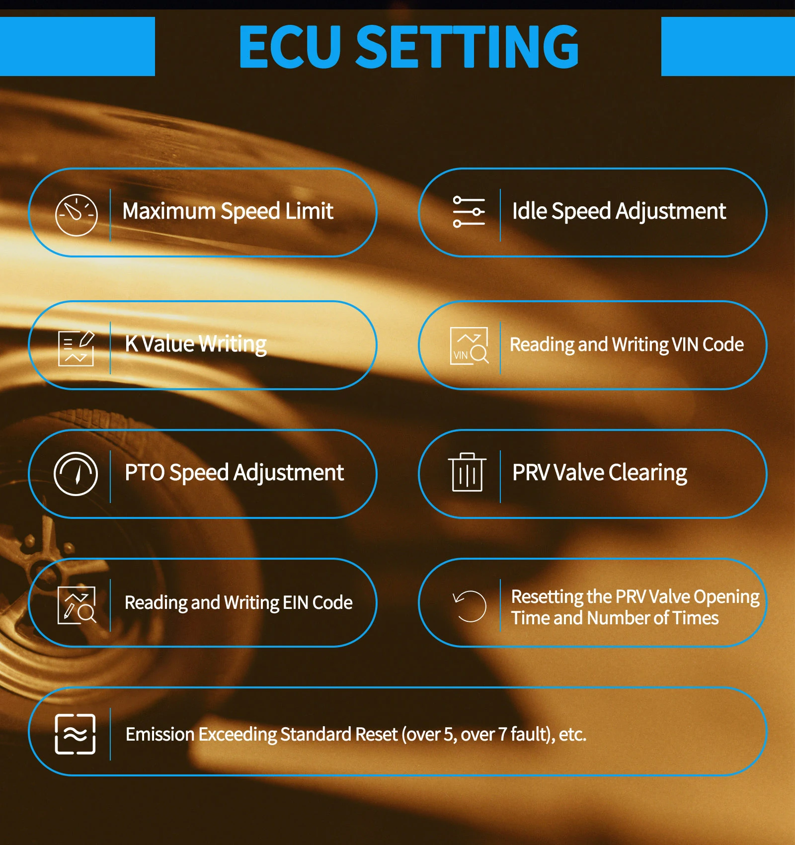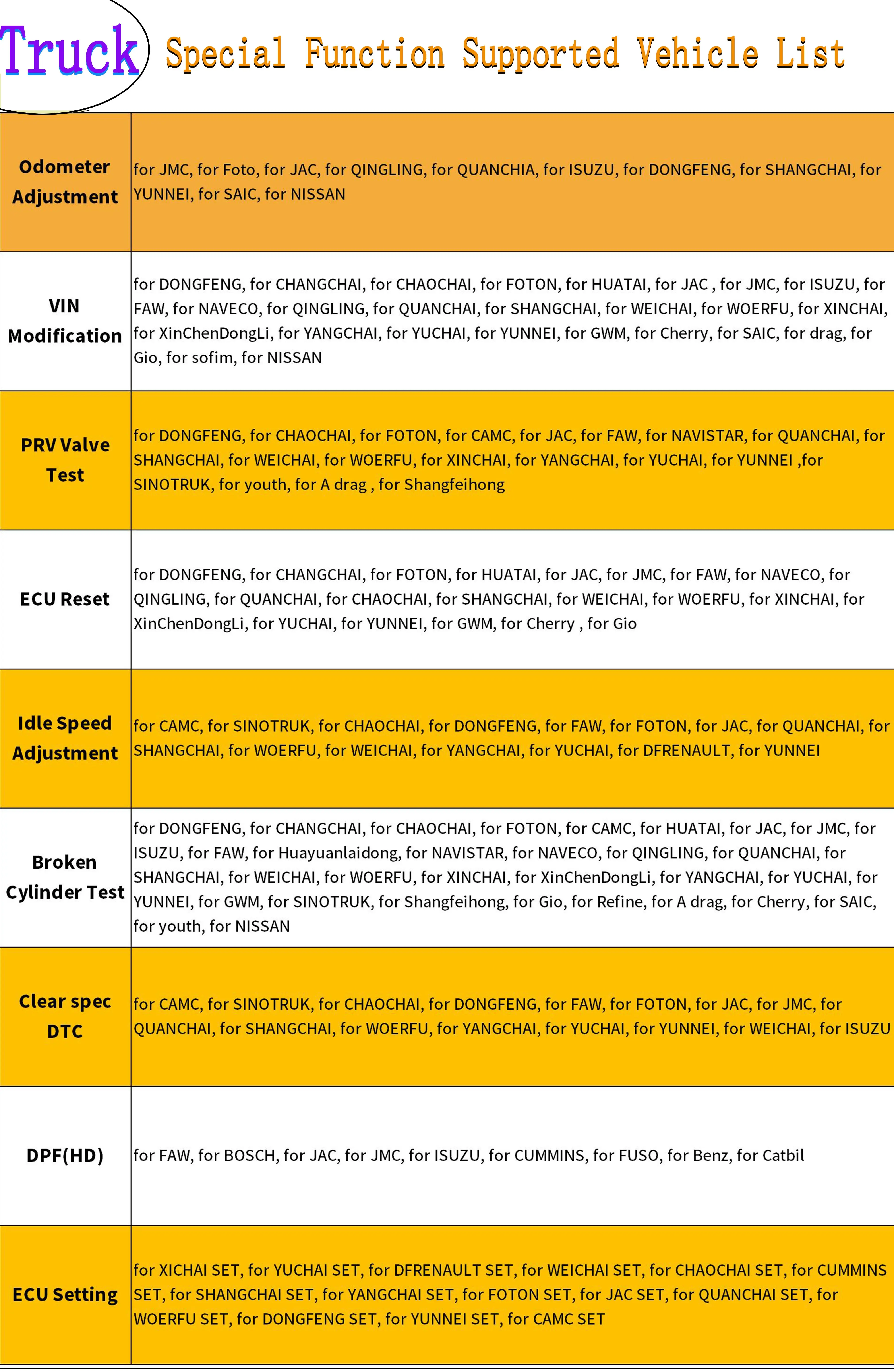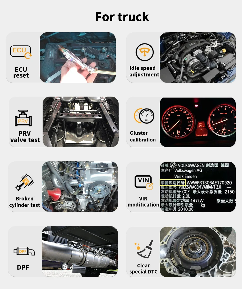 Truck: VIN Modification, PRV Valve Test, ECU Reset, Idle Speed Adjustment, Broken Cylinder Test, ECU Programme, Clear Spec DTC, DPF are included to meet your additional needs.