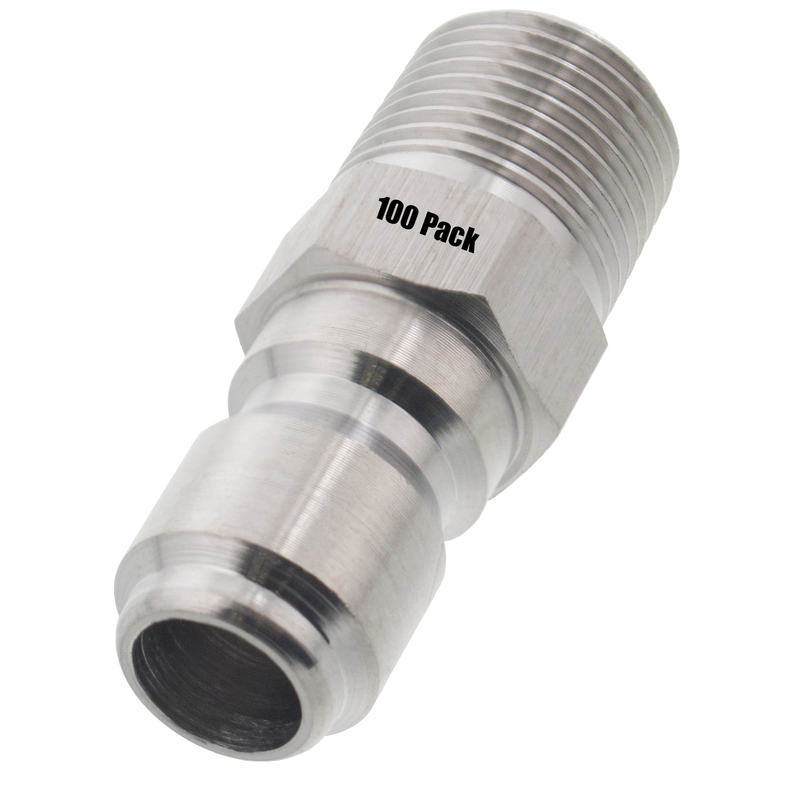 100 pack of Erie Tools 3/8-inch male NPT to male Quick Connect stainless steel couplers for pressure washer attachments. Coupler will handle 4,000 PSI, 10.5 GPM, and temperatures up to 212° F.