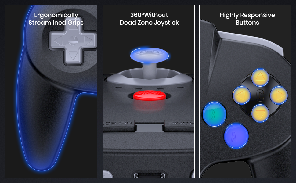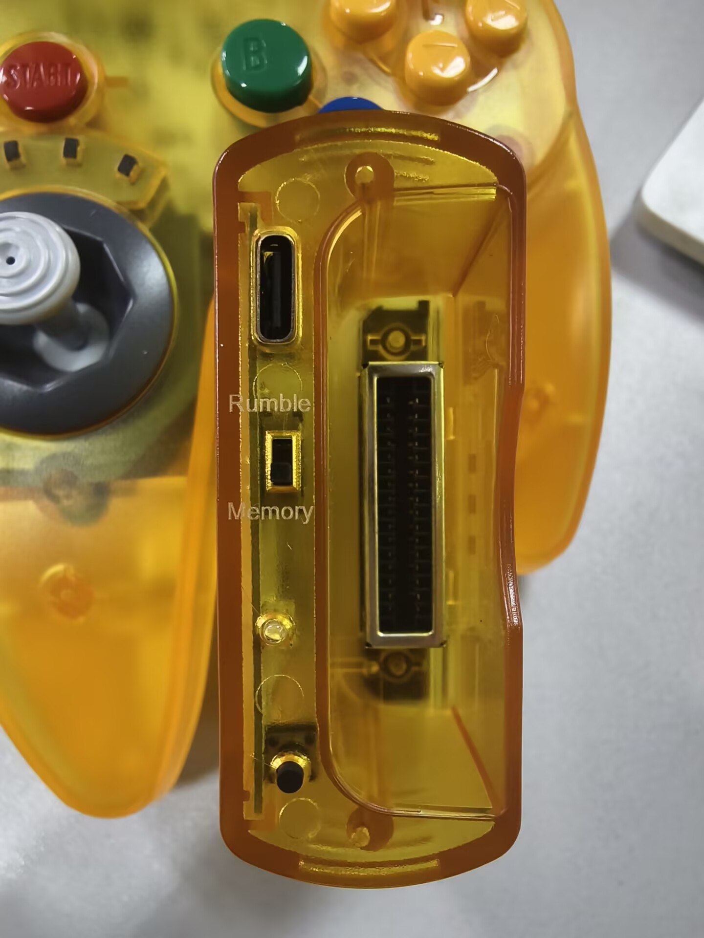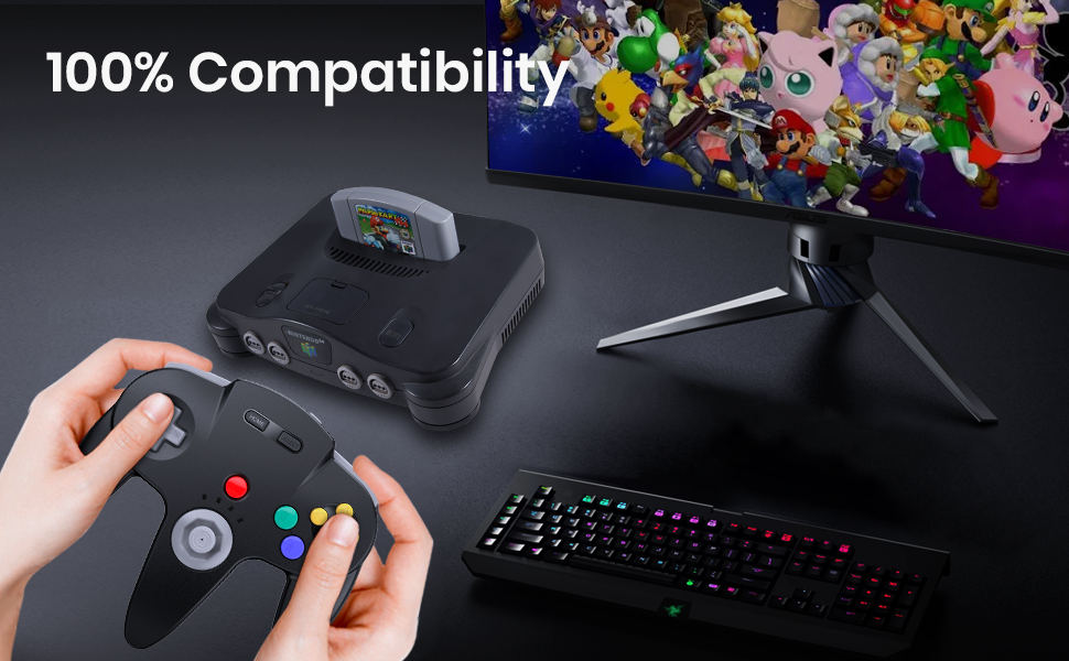 Compatible with original game memory cards, third-party game memory cards, and standard storage memory cards (plug the card on n64 receiver)-rumble function/memory card function control is on n64 adapter,