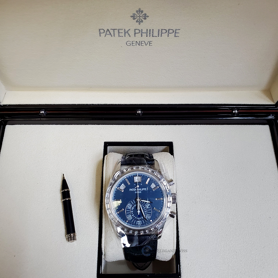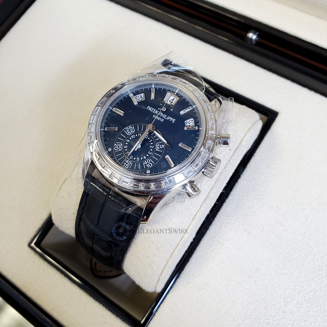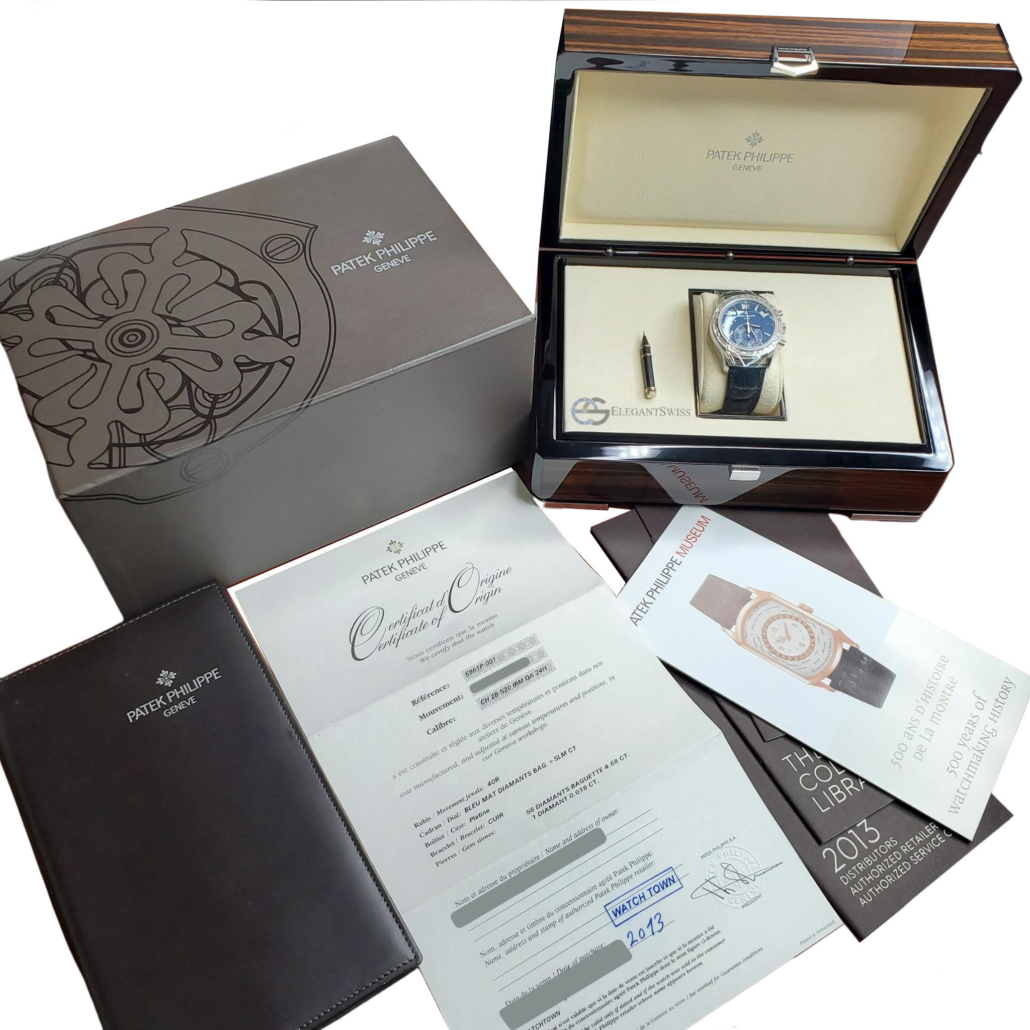 Patek Philippe 5961P 001 Complications Annual Calendar Blue Baguette Diamond Chronograph Watch Box Papers