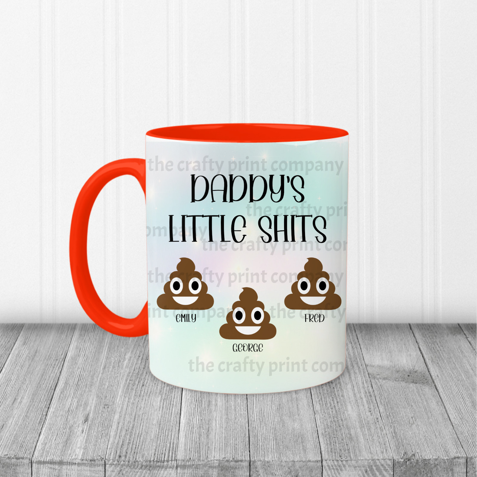 Black, Light blue, Red and Pink or you can choose just a plain white mug. 11oz