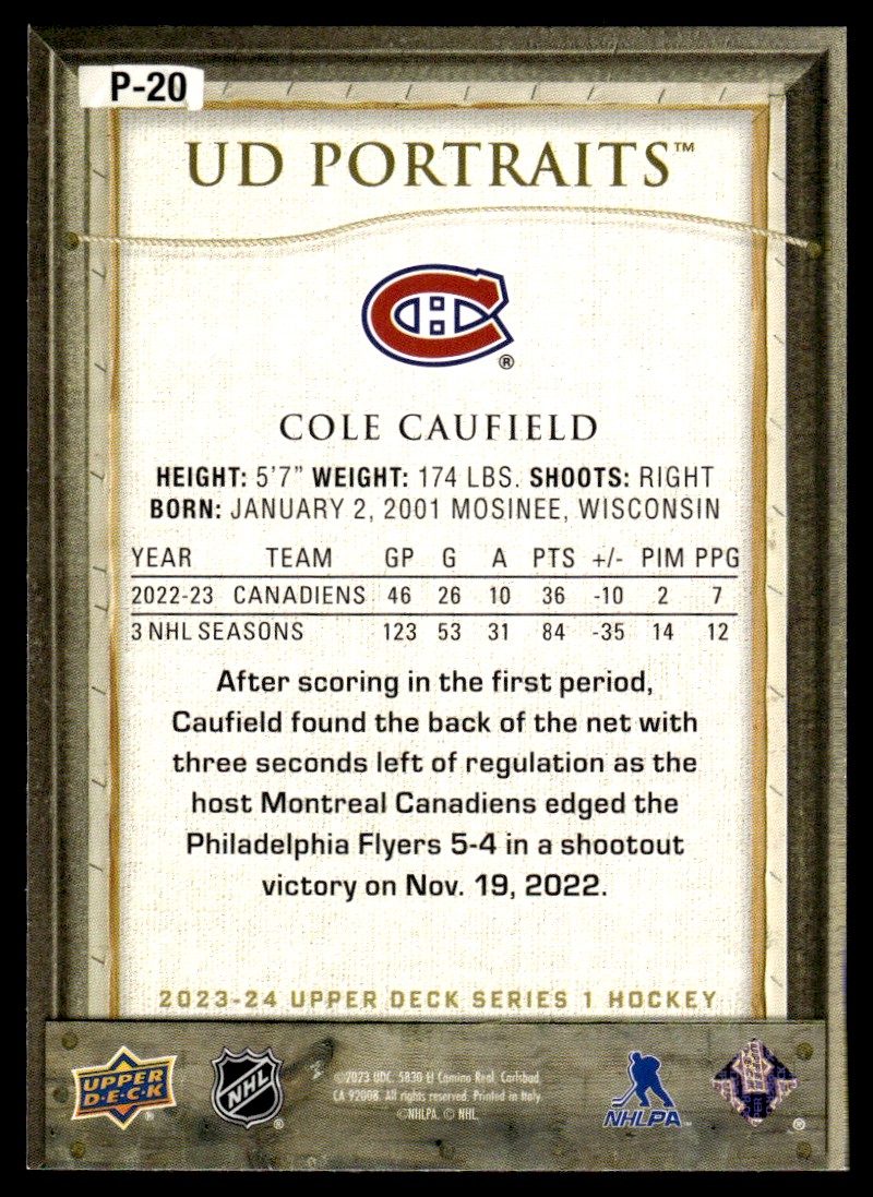 | Cole Caufield 2023-24 Upper Deck UD Portraits #P-20 Hockey Card |