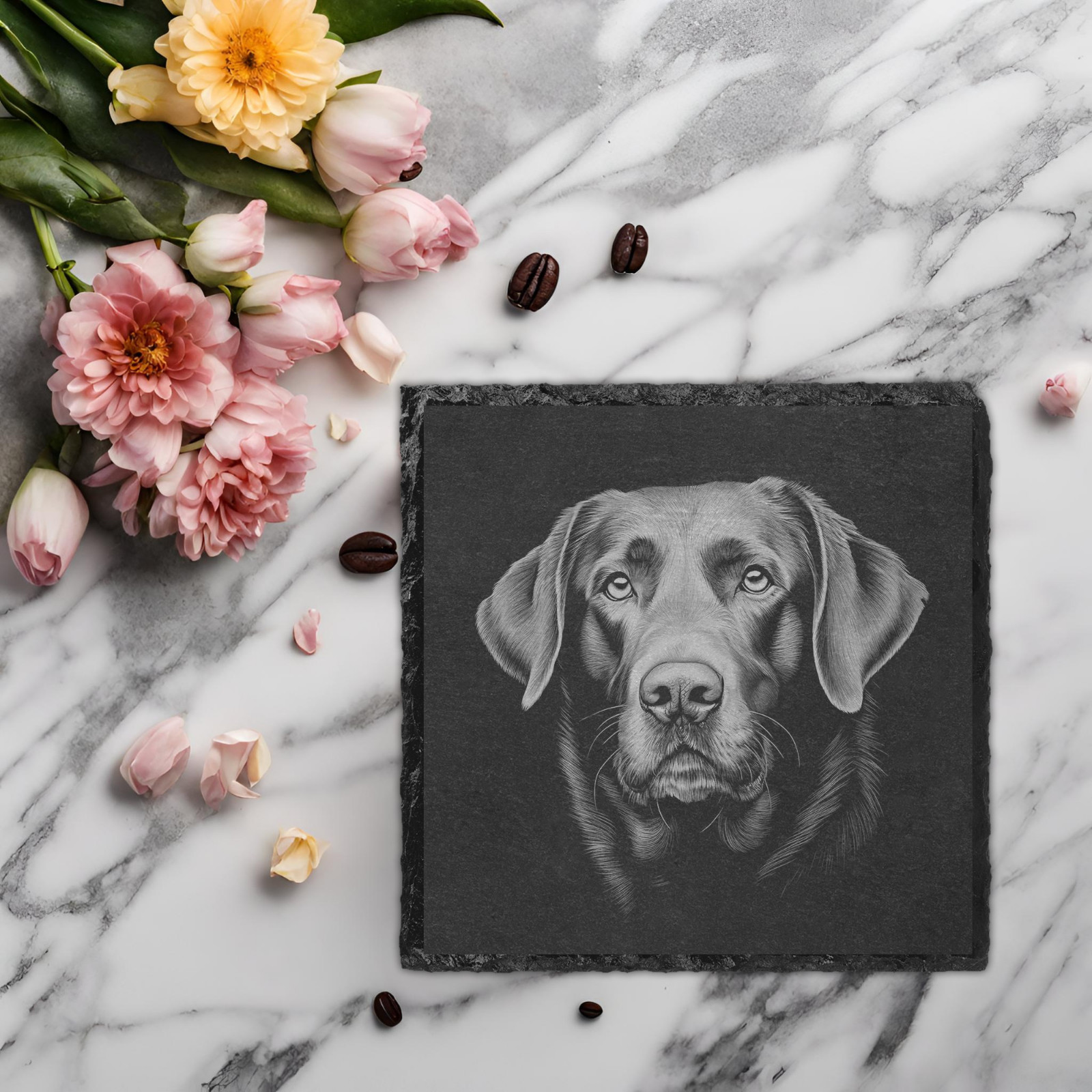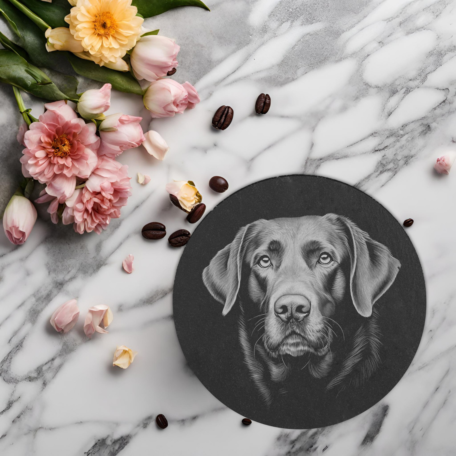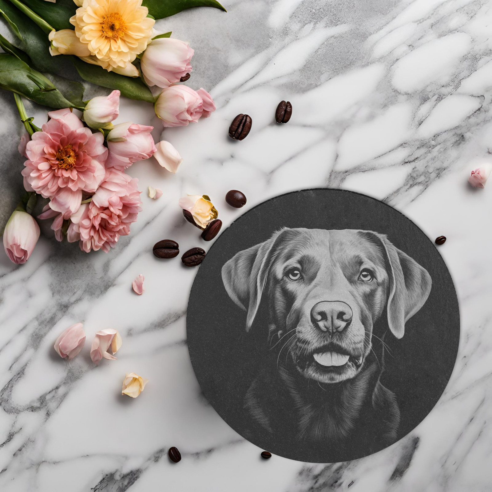 Add a touch of canine charm to your Father's Day celebrations with this engraved slate coaster. Featuring an adorable Labrador design, this square or round coaster is the perfect addition to any home bar or dining table.