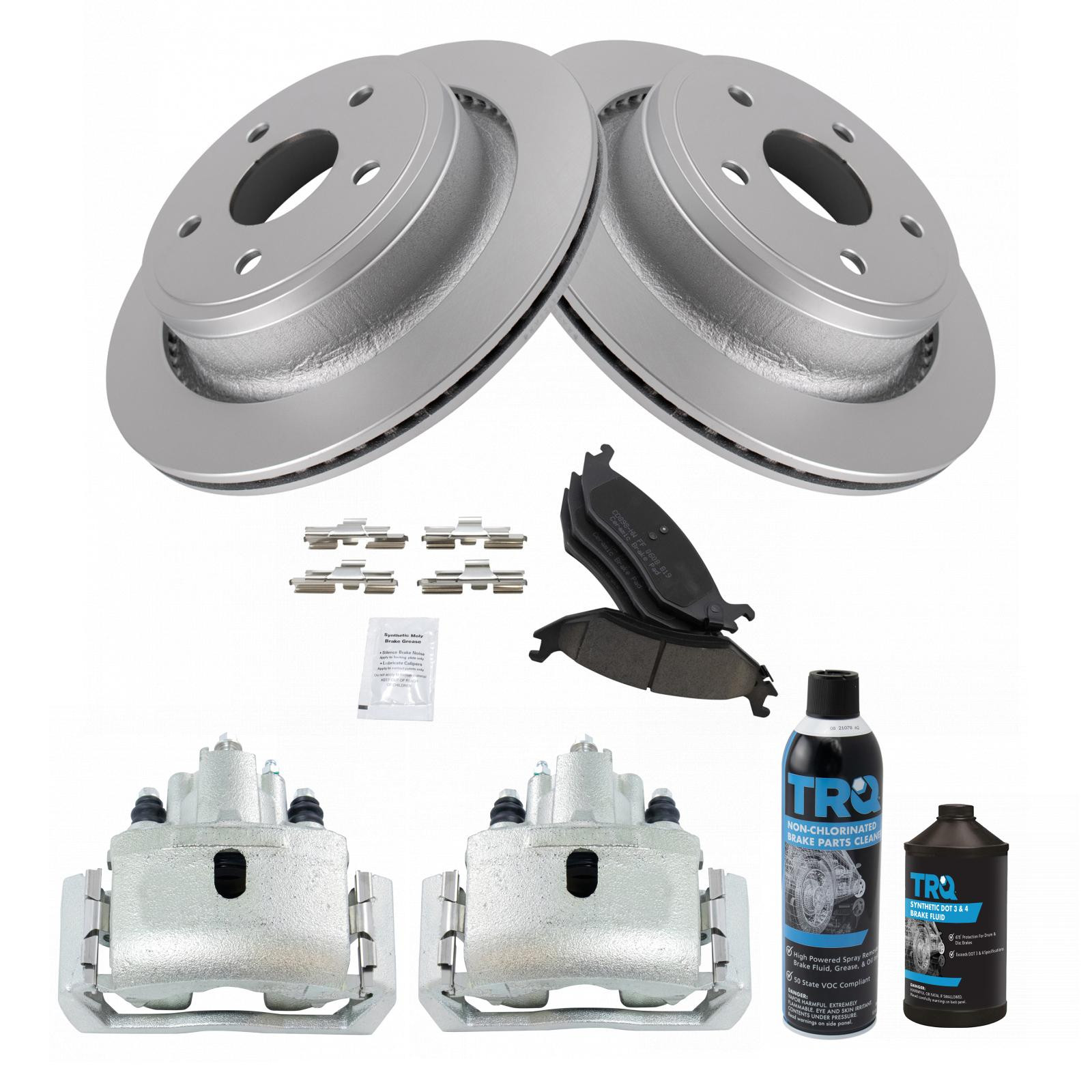 Kit Includes:(1) 13 oz Non-Chlorinated 50 State Formula Brake Cleaner, Kit Includes:(1) Rear Ceramic Brake Pad Set with Contact Point Grease & Hardware, Kit Includes:(1) 12 oz DOT 3 & 4 Brake Fluid, Kit Includes:(2) Rear Brake Calipers with Mounting Brackets & Hardware, Kit Includes:(2) Rear G-Coated Brake Rotors
