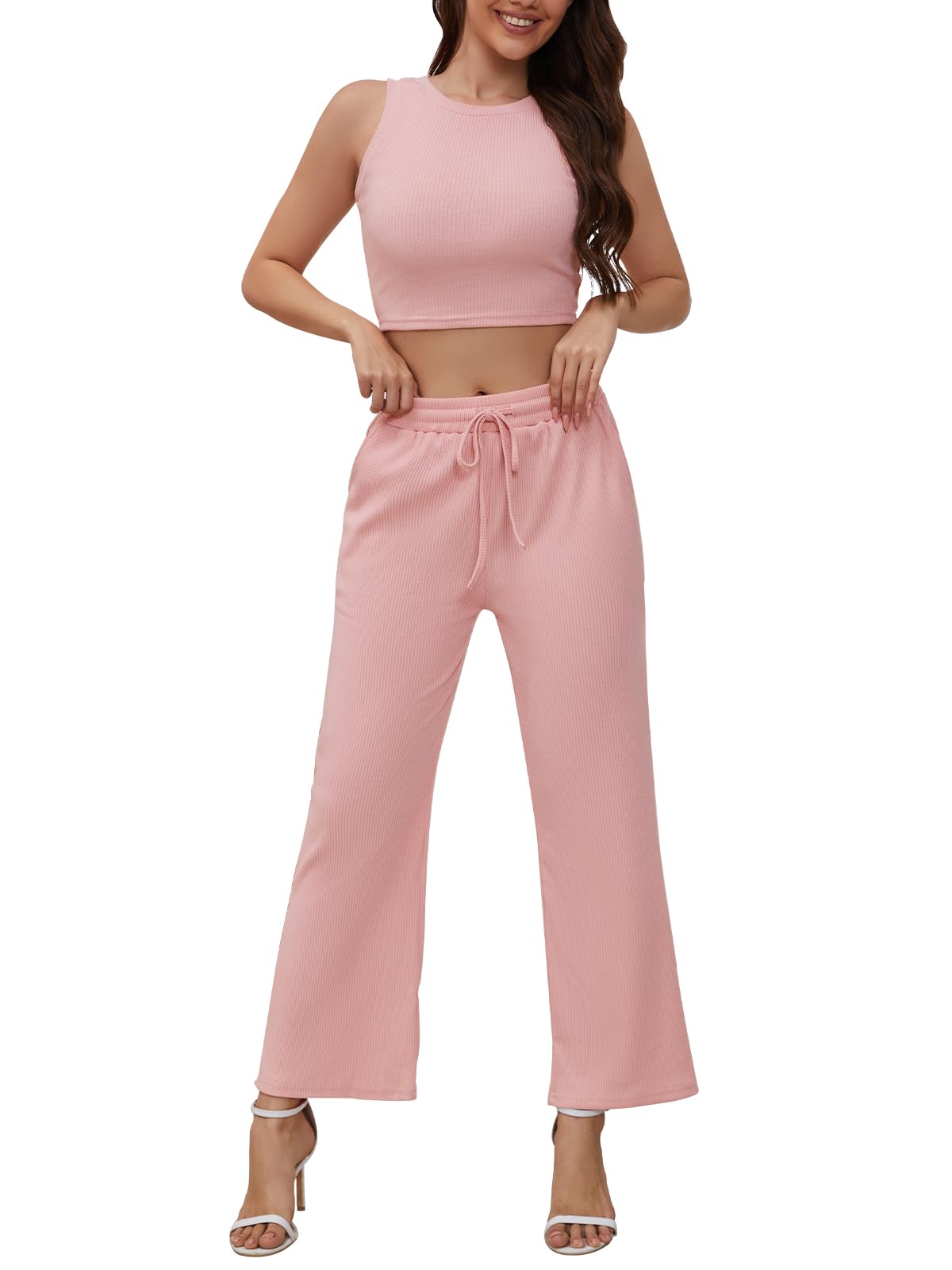 Ribbed Knit Lounge Set: Sleeveless Crop, Wide Leg Pants (Pink, M)