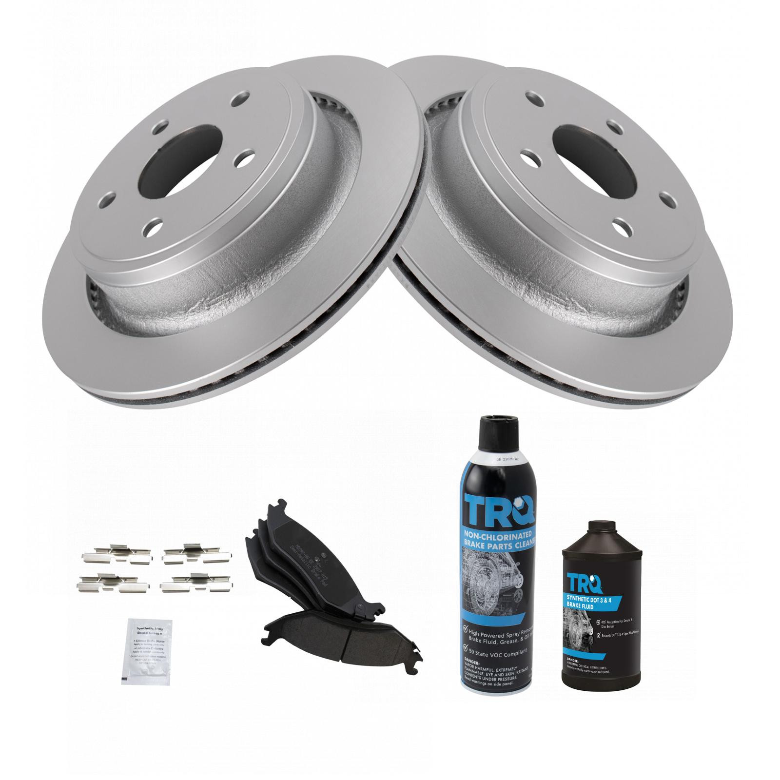 Kit Includes:(1) 13 oz Non-Chlorinated 50 State Formula Brake Cleaner, Kit Includes:(1) Rear Semi-Metallic Brake Pad Set with Contact Point Grease & Hardware, Kit Includes:(2) Rear G-Coated Brake Rotors, Kit Includes:(1) 12 oz DOT 3 & 4 Brake Fluid