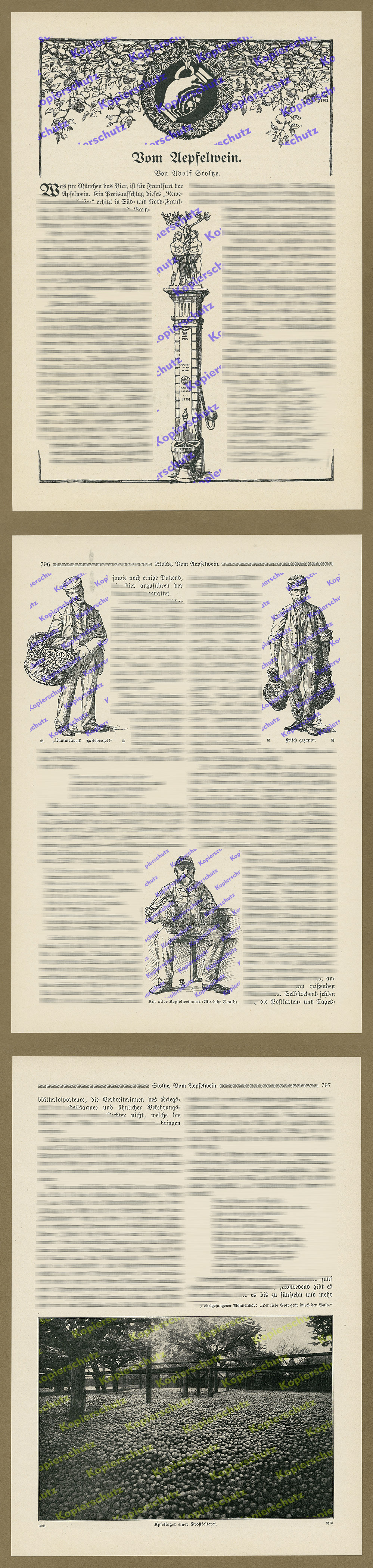 20. Jahrhundert, 1912, 60311, Alt Sachsenhausen, Apfel, Äpfel, Apfelwein, Äpfelweinsube, Apfelweinwirt, Äppelweigeschworene, Behaglichkeit, Bembel, Brauchtum, D-60528 Frankfurt am Main, D-60594 Frankfurt am Main, Deutsche Geschichte, Deutsches Reich, Dialekt, Ernte, Essen und Trinken, Feier, Festlichkeit, Frankfurter Stadtwald, Frankfurt-Niederrad, Gartenbau, Gärtnerwirt, Gastronomie, Gemütlichkeit, Getränke, Gewerbe, Grosse Rittergasse, Großstadt, Handel, Heckenwirte, Heckenwirtschaft, Heimatkunde, Hessen, Hessisch, Hohenastheimer, Kelter, Kelterei, keltern, Kultur, Kulturgeschichte, Kunst, Kunstgeschichte, Landeskunde, Landwirtschaft, Mundart, Mainmetropole, Niederrad, Oberrad, Obst, Ortskunde, Pomologie, Rauscher, Schankwirt, Schoppen, Stadtgeschichte Frankfurt, Stadtleben, Süßer, Topographie, Tradition, Trinker Ausschank, Volksfest, Volksleben, Wäldchestag, Wäldchestag, Wirt, Wirtschaftsleben, Zecher Apfelwein, auch Apfelmost, Saurer Most, Viez oder regional nur Most genannt, ist ein Fruchtwein, der meistens aus einer Mischung verschiedener, relativ säurehaltiger Äpfel gekeltert und vergoren wird. Auch Holzäpfel können so genutzt werden. Der natürliche Alkoholgehalt beträgt 5 bis 7 Vol.-%. Apfelwein hat meist einen herben, sauren Geschmack, da zu seiner Herstellung traditionell Äpfel verwendet wurden, die anderweitig schlecht zu gebrauchen waren. Je nach den verwendeten Äpfeln muss der Geschmack deshalb nicht notwendigerweise herb und sauer sein. Heimgekelterter Apfelwein ist eher milder als der im Handel angebotene, bei höherem Alkoholgehalt. Trüber Apfelwein ist ein Kunstprodukt, traditionell hergestellter klärt sich, er ist "durchgegoren", im Verlaufe des Gärprozesses sinken die durch den steigenden Alkoholgehalt abgestorbenen Hefen und Fruchtbestandteile auf den Boden des Gärbehälters. Deshalb darf ein heute bei Hausherstellung meist verwendetes Gärfass aus Kunststoff auch nicht bewegt werden, da sonst die abgesunkenen Trübstoffe den Apfelwein verderben können. Name Apfelwein wird im Süd- und Mittelhessischen, im Frankfurterischen und im Unterfränkischen auch „Ebbelwoi“, „Äbbelwoi“, „Ebbelwei“ oder „Stöffsche“ genannt. „Hessischer Apfelwein“ ist eine geschützte geographische Angabe. Bei dem in den Medien häufig verwandten Begriff „Äppler“ handelt es sich nicht um eine traditionelle Bezeichnung, sondern um einen Kunstnamen, der in den 1980er Jahren von Großkeltereien zu Werbezwecken eingeführt wurde. In traditionellen Apfelweinschenken wird der Apfelwein meist schlicht als „Schoppen“ (frankfurterisch „Schobbe“, der Trinkende als „Schobbepetzer“) bezeichnet. An der Mosel, in der Eifel, im Hunsrück, an der Saar und in Luxemburg trägt er den Namen „Viez“, der aus römischer Zeit (lat. vice = der zweite oder stellvertretende Wein, Vice – vinum = Weinersatz) stammt und andeutet, dass Apfelwein als Ersatz für den echten Wein getrunken wurde. Im Oberdeutschen ist die übliche Bezeichnung Most, dem in vielen Regionen – u. a. im österreichischen Mostviertel – auch Birnenmost beigemischt wird. In der Schweiz wird der vergorene Apfelsaft „sure Moscht“ oder „sure Saft“ genannt. Geschichte Schon die Griechen und Römer kannten die Herstellung des Apfelweines (lat. vinum ex malis factum), so auch in Augusta Treverorum, dem heutigen Trier. Plinius der Ältere (23 bis 79 n. Chr.) berichtet: „Vinum fit e piris malorumque omnibus generibus“ (man macht Wein aus Birnen und allen Sorten von Äpfeln) und führt auch Mostäpfel (mustea) an. Der Ackerbauschriftsteller Palladius beschreibt im 4. Jahrhundert n. Chr. die Zubereitung des Weines aus Birnen. Auch ist belegt, dass die Germanen, bereits bevor die Römer kamen, sich in der Herstellung des Obstweines auskannten (überlieferte germanische Benennung: Ephiltranc). Durch die Niederlassung der Römer kamen dann andere Obstsorten ins Land, die das einheimische Wildobst verdrängten. Es kam zur Belebung der Obstweinproduktion. Erstmals wird der Apfelwein um das Jahr 800 erwähnt, in Frankfurt ist er erst 800 Jahre später, um das Jahr 1600, nachgewiesen. Bereits 1638 wurde per Ratsverordnung eine Reinhaltungsbestimmung festgelegt, an die sich die Apfelweinkelterer noch heute halten müssen. 1754 wurde die erste Schankerlaubnis in Frankfurt erteilt, seit diesem Zeitpunkt wurde das Getränk auch versteuert. Entgegen der gängigen Meinung ist jedoch der Apfelwein zu dieser Zeit keinesfalls als Traditionsgetränk dieser Gegend anzusehen, sondern eher als ein minderwertiges Gelegenheitsgetränk für arme Leute, das vorwiegend in Heimherstellung produziert wurde. Das Frankfurter Traditionsgetränk war demgegenüber damals vielmehr der hervorragende Wein der Maingegend. Erst mit dem Verfall der Weinkultur infolge von Klimaveränderungen, von militärischen Verwüstungen im Zuge der Annektierung der Freien Stadt Frankfurt durch Preußen und der ab Mitte des 19. Jahrhunderts in Europa einsetzenden Ausbreitung der aus Amerika eingeschleppten Reblaus begann die Erfolgsgeschichte des Apfelweins als Weinersatz. Herstellung Apfelwein ist herkömmlich ein reines Naturprodukt. Wie „naturtrüb“ der Apfelwein im Endeffekt ist, hängt davon ab, wie viel Klärstoffe sich durch die Zugabe saurer Früchte bilden. Bei der frühesten Herstellung des Apfelweins wurden die Äpfel zunächst von Hand in einem großen Trog zerstoßen. In späteren Zeiten zerkleinerte ein von Pferden oder Menschen angetriebener Mahlstein die Früchte. Beim Zerkleinern dürfen die Äpfel nicht nur geschnitten werden, sondern es muss auch Druck auf die Apfelstücke ausgeübt werden, damit sie braun werden und später in der Kelter den Saft abgeben. Anschließend schlugen die Kelterer die Masse aus zerstoßenen Äpfeln in engmaschige Baumwolltücher ein und stapelten die so entstehenden Päckchen auf einem Holzrost. Durch Drehen eines Holzbalkens wurde ein Brett auf den Holzrost gesenkt, das den Stapel