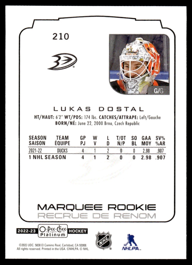 | Lukas Dostal Rookie Marquee 2022-23 O-Pee-Chee Platinum #210 Hockey Card Anaheim |