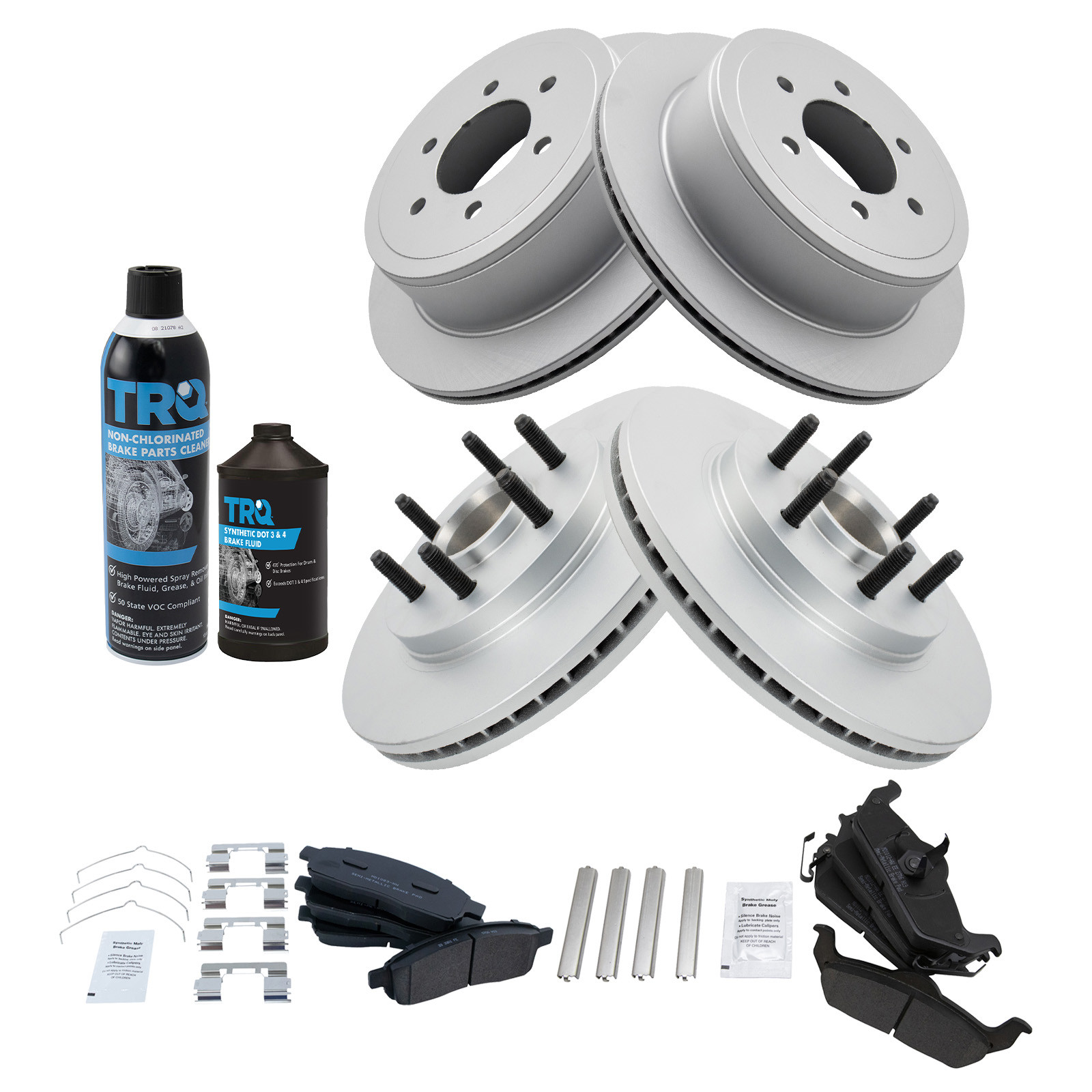 Kit Includes:(2) Front G-Coated Brake Rotors, Kit Includes:(2) Rear G-Coated Brake Rotors, Kit Includes:(1) 12 oz DOT 3 & 4 Brake Fluid, Kit Includes:(1) Front Semi-Metallic Brake Pad Set with Contact Point Grease & Hardware, Kit Includes:(1) Rear Semi-Metallic Brake Pad Set with Contact Point Grease & Hardware, Kit Includes:(1) 13 oz Non-Chlorinated 50 State Formula Brake Cleaner