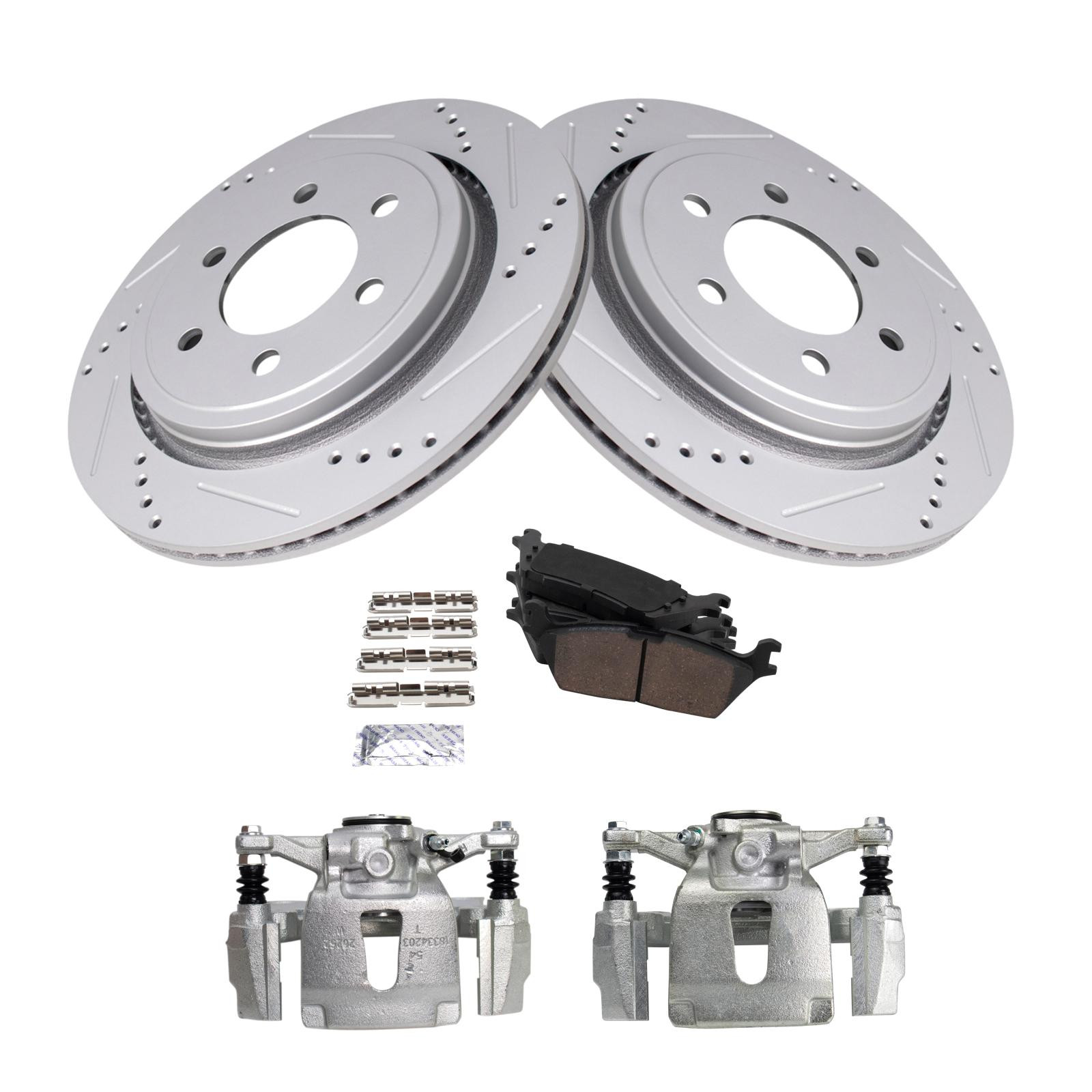 Kit Includes:(2) Rear Performance Brake Rotors, Kit Includes:(1) Rear Ceramic Brake Pad Set with Contact Point Grease & Hardware, Kit Includes:(2) Rear Brake Calipers with Hardware & Mounting Brackets
