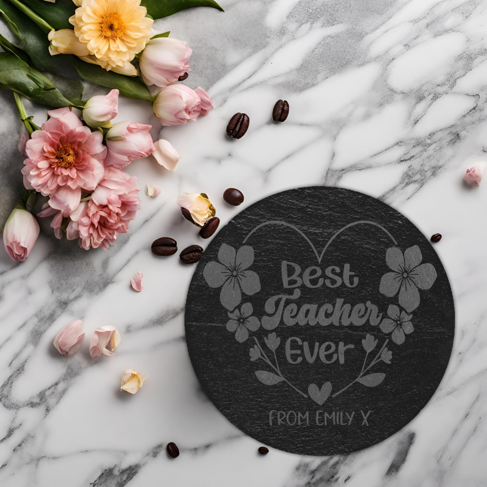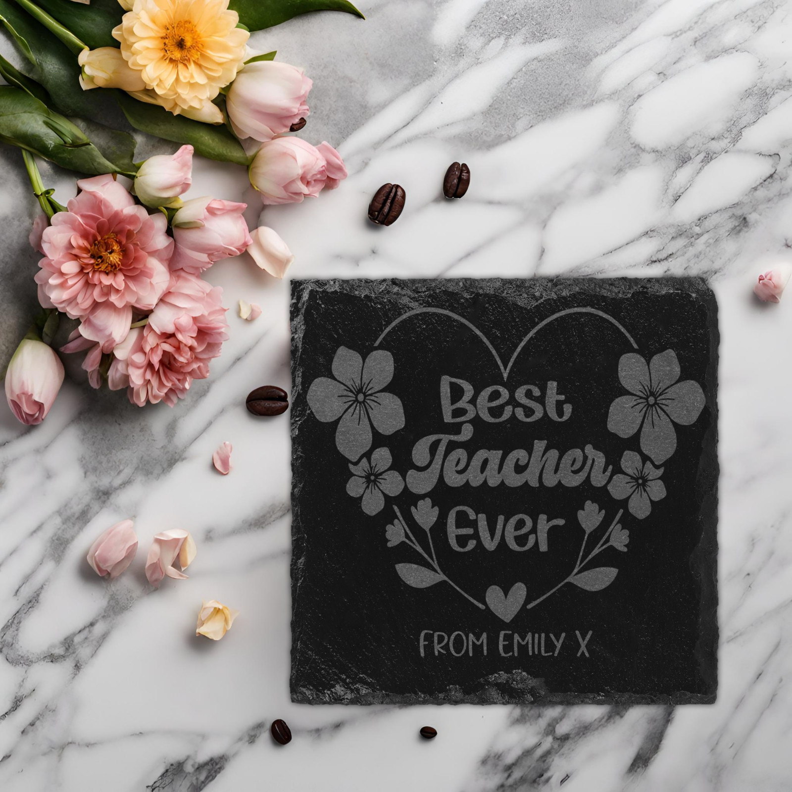 Elevate your Teacher's End of Term gift game with this personalised engraved slate coaster. Perfect for their cup of tea, this modern square or round coaster features a sleek black colour and is stain and water-resistant.Crafted in the United Kingdom, this coaster is made of high-quality slate and makes for a stylish addition to any home bar or kitchen. Not only is this coaster functional, but it also adds a touch of elegance with its unique, custom engraving.The coaster can be personalised with any name(s) of your choosing, making it a thoughtful and memorable gift. Don't settle for a boring gift this End of Term, give the gift of style and functionality with this engraved slate coaster.Made from high-quality slate, it's stain and water-resistant, ensuring that it will look great for years to come. The coaster is expertly crafted in the United Kingdom and boasts a stylish black colour that complements any decor. It's the perfect gift for any occasion. While your dad is enjoying a cup of tea, this coaster will ensure that his surfaces stay protected. Size: Square 10cm x 10cm          Round 10cm Each piece has been individually cut from genuine, natural slate to give a unique finish, sure to suit any style of dining room decor while satisfying one of the hottest tableware trends of recent seasons. Soft, padded feet on the base prevent scratches, ensuring both mat and table will remain looking their best for years to come. Equally suited to both home and professional use, care and cleaning of these pieces couldn't be simpler - simply wipe with a damp cloth at the end of the night to leave them looking as good as new. Features & Benefits: Natural Slate - Individually cut pieces for a unique finish every time Soft, Padded Rubber Feet - Protect table tops and surfaces from scratches Heat Resistant - Serve hot dishes fresh from the oven Easy to Clean - Wipe with a damp cloth