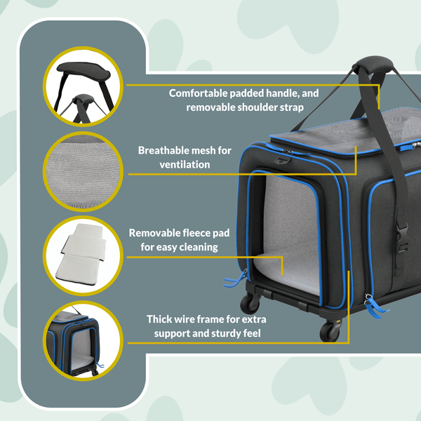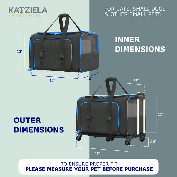 Introducing the Rolling Rover, a roomy pet carrier ideal for pets who enjoy exploring! Designed for all kinds of trips, whether by plane, car, or bus. It comes with wheels that can be easily taken off, a soft-sided structure for comfort, and a plush fleece bed for extra coziness. It's great for cats, small dogs, rabbits, and ferrets. Katziela carriers are approved for air travel and lightweight for convenience. The double telescopic handle makes it simple to move around. Details include the outer fabric: 85% polyester / 15% PVC, mesh: 80% nylon / 20% polyester, trim: 100% polyester, foam: 100% EPE, liner, webbing, fleece pad: 100% polyester, and zipper: 100% nylon.