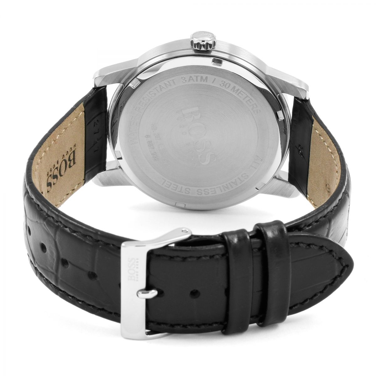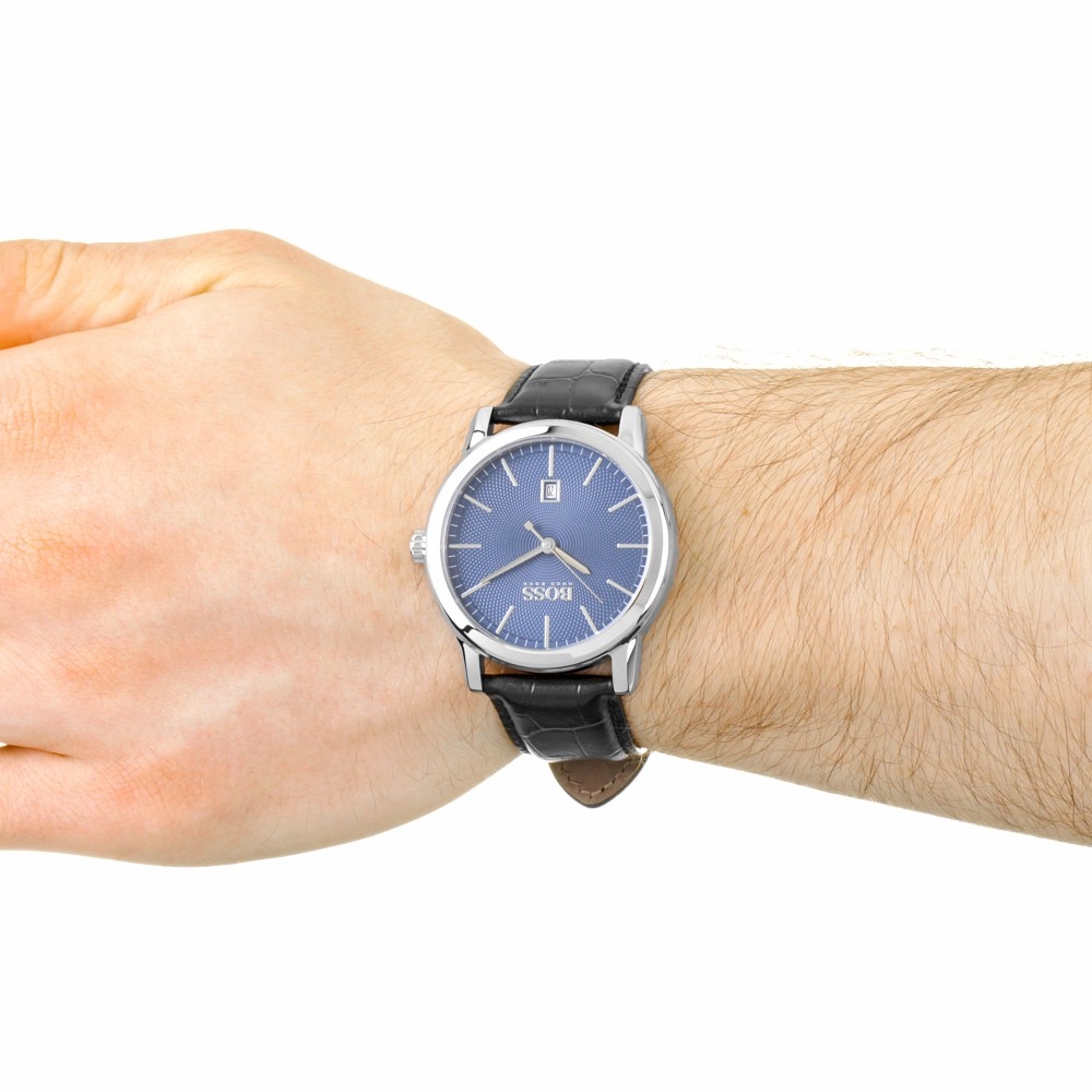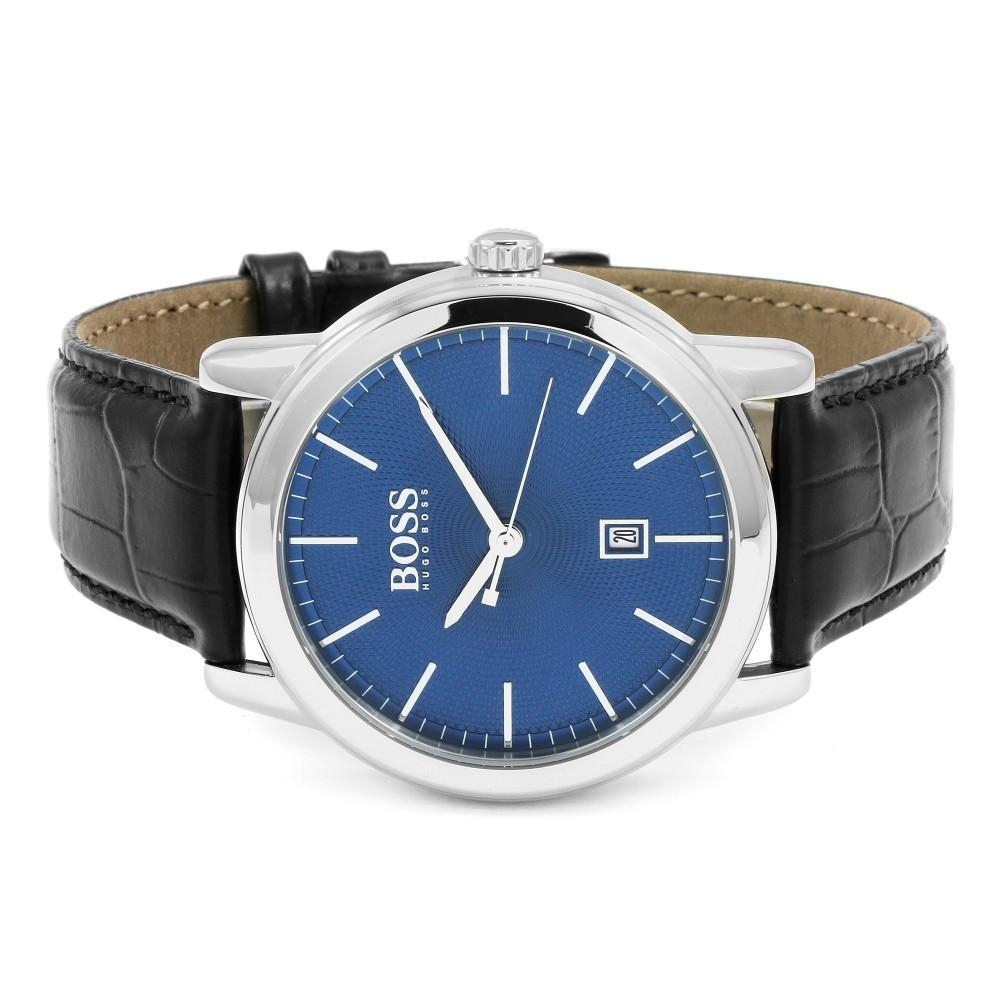 Gents Hugo Boss watch collection. Stainless steel case. Black leather strap. Blue tone dial. Date display at 6 o'clock position. Case size: 42 mm. Scratch resistant: mineral crystal. Water resistant: 30 meters /100 feet. Movement: Quartz. Comes with original box and booklet. Warranty: 1 Years.