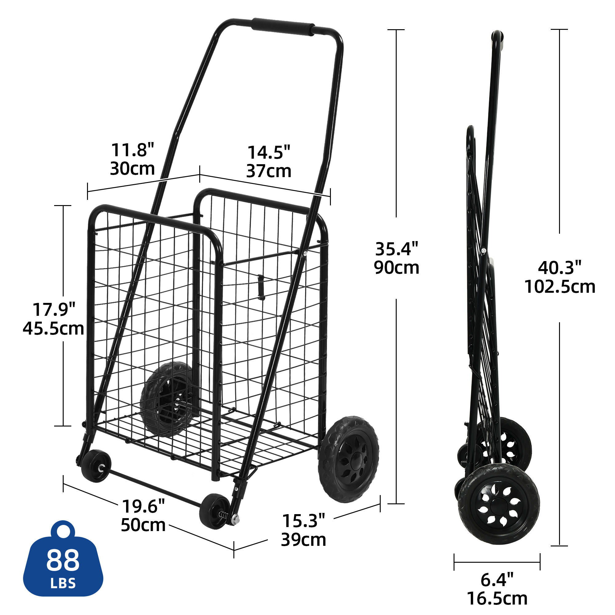 Lightweight and Portable: Made from lightweight materials, this shopping cart is easy to carry and transport. It weighs only 5.5 pounds, making it ideal for seniors or individuals who may have difficulty carrying heavy loads. Take it with you to the grocery store, farmers market, or even on laundry day. Ample Storage Capacity: Despite its compact size, this folding shopping cart offers ample storage capacity, it can hold up to 88 pounds. The spacious basket can hold groceries, laundry, or other items.