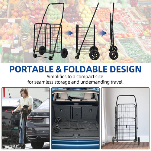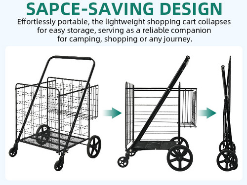 Easy Folding Design: This shopping cart features a foldable design, allowing for easy storage and transportation. Simply collapse the cart with a quick motion, and it becomes compact and space-saving. Perfect for seniors or anyone with limited storage space.