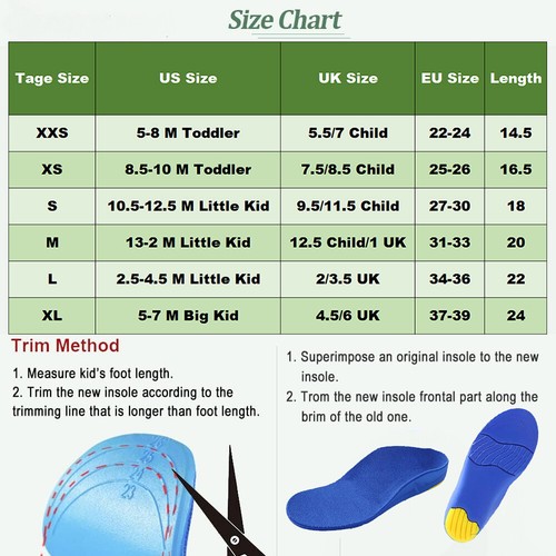 •     ARCH SUPPORT ORTHOTICS: Kids orthotic inserts are specially designed for Children who have severe fatigue and discomfort in their feet and legs due to high/low arch. Stable arch support of 3.5 cm height provides effective full arch support for preventing and relieving common feet pain. Ideal orthopedic insoles for kids with flat feet, over pronation, high arch, O/X leg, foot pain, arch pain, heel spur & plantar fasciitis.