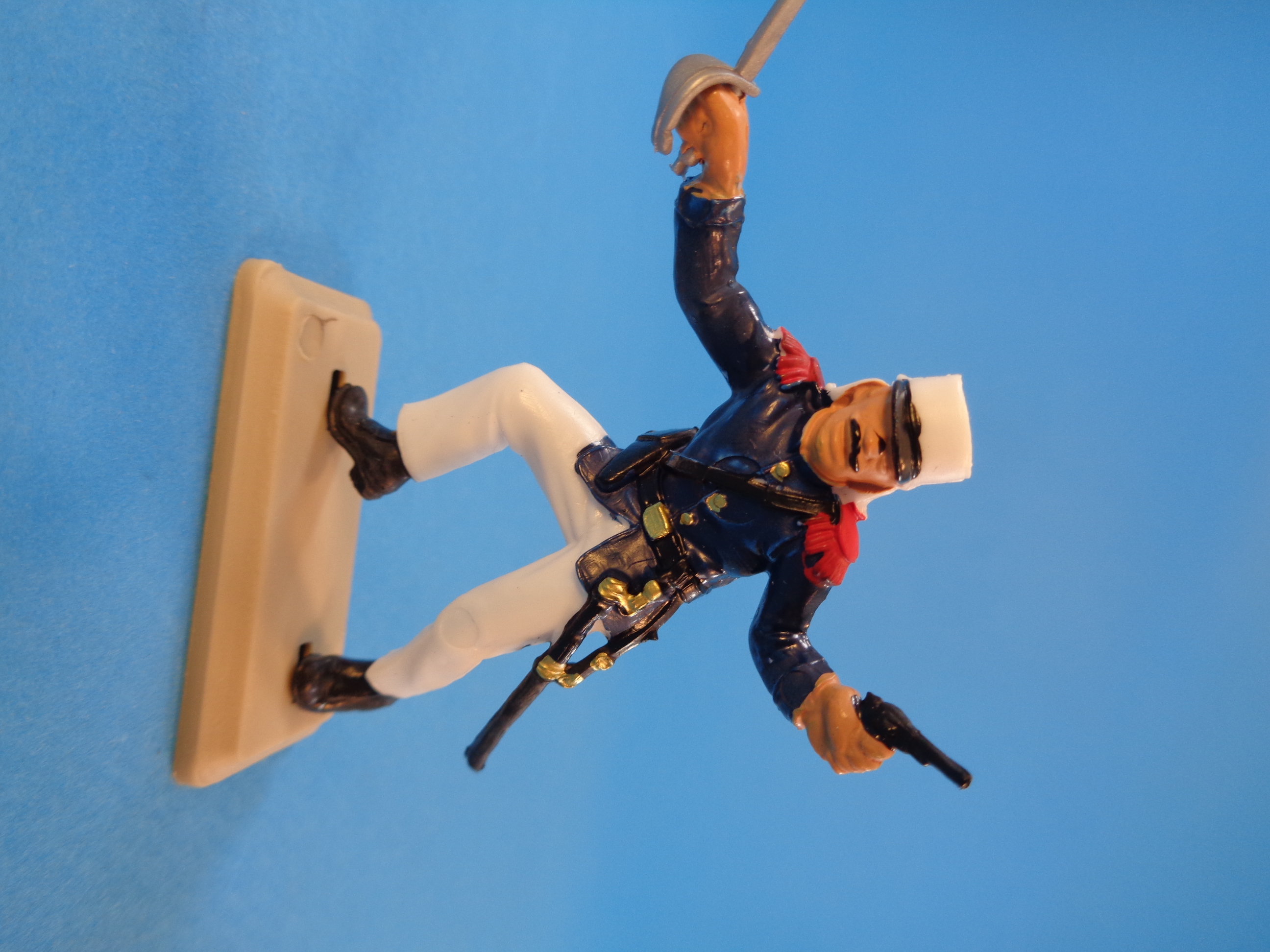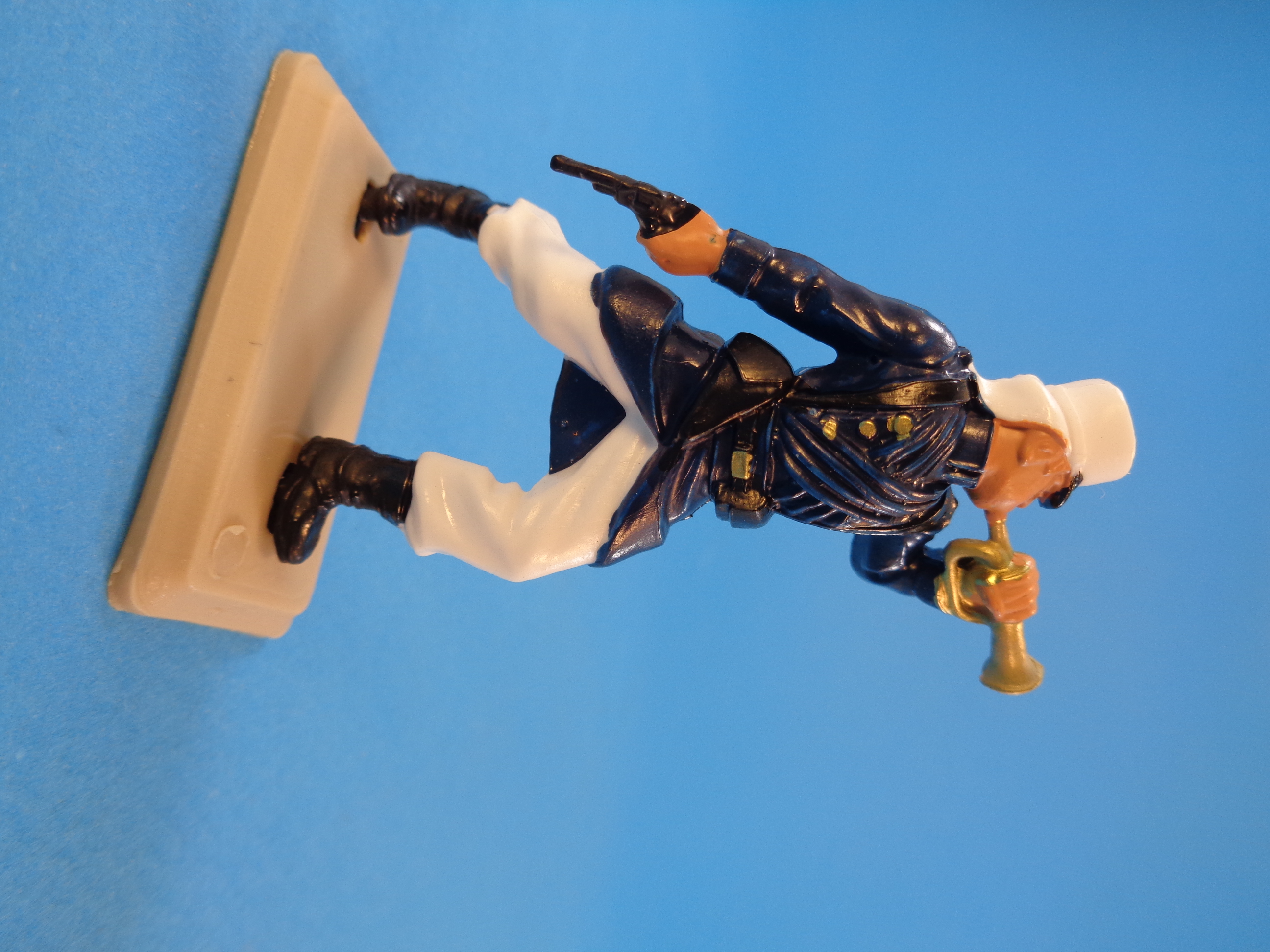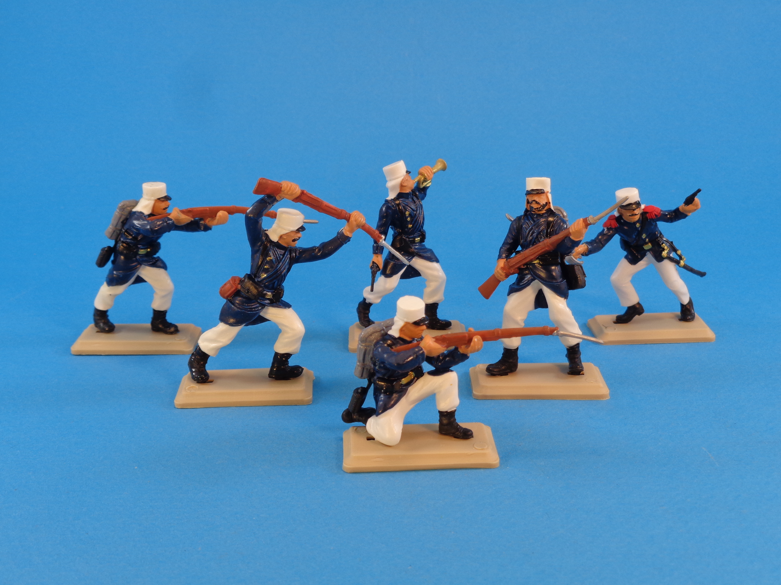 The set is made up of plastic six figures (one officer and five regular soldiers) in different action positions, wearing blue tunics and white trausers and kepi.